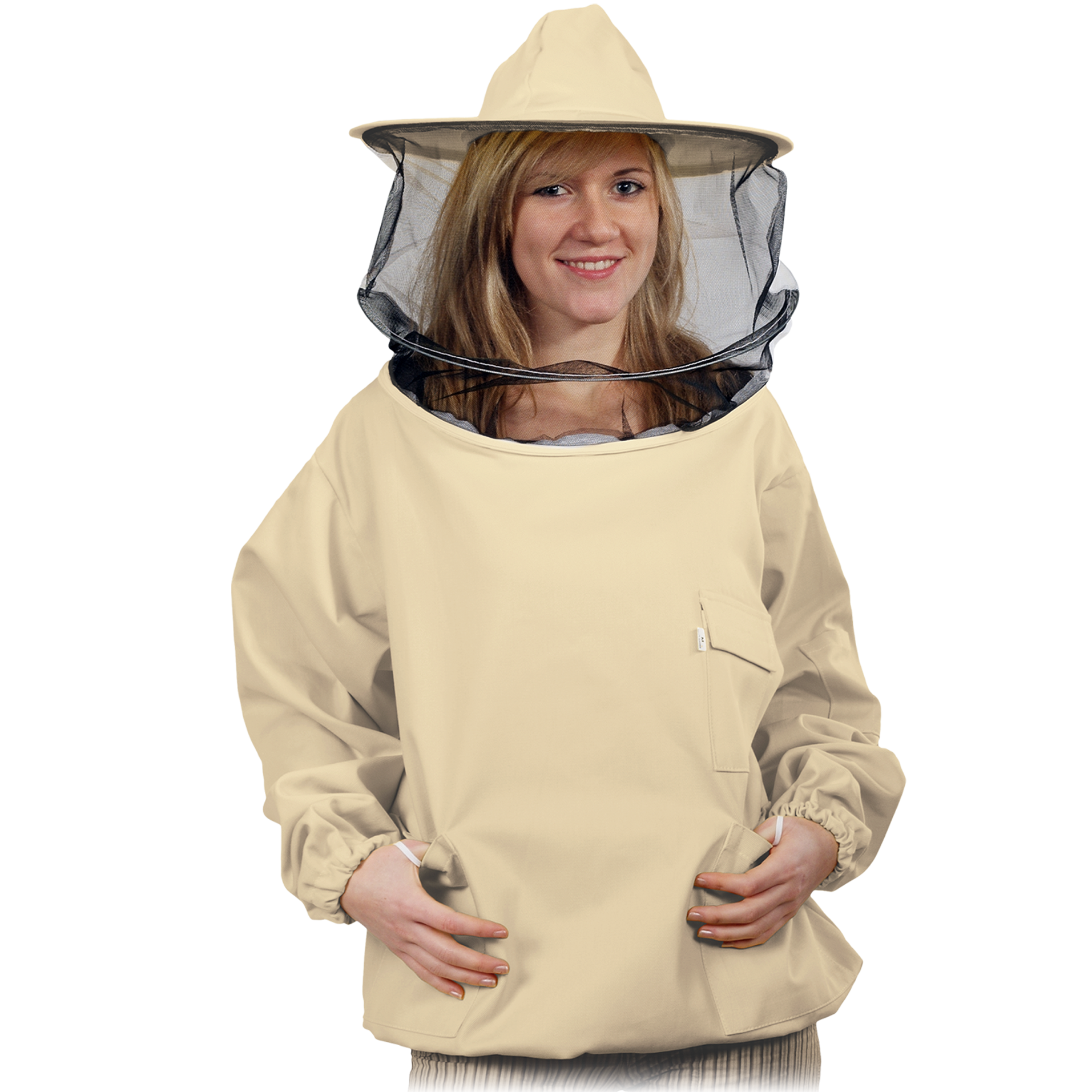 This beekeeper's jacket with a snap-on hat provides maximum comfort and protection during beekeeping. It is made of 100% cotton, making it extremely comfortable and breathable. The jacket has a zipper and a removable hat in the collar. There are elastic bands on the sleeves and waist to ensure a tight fit and protection from bees.