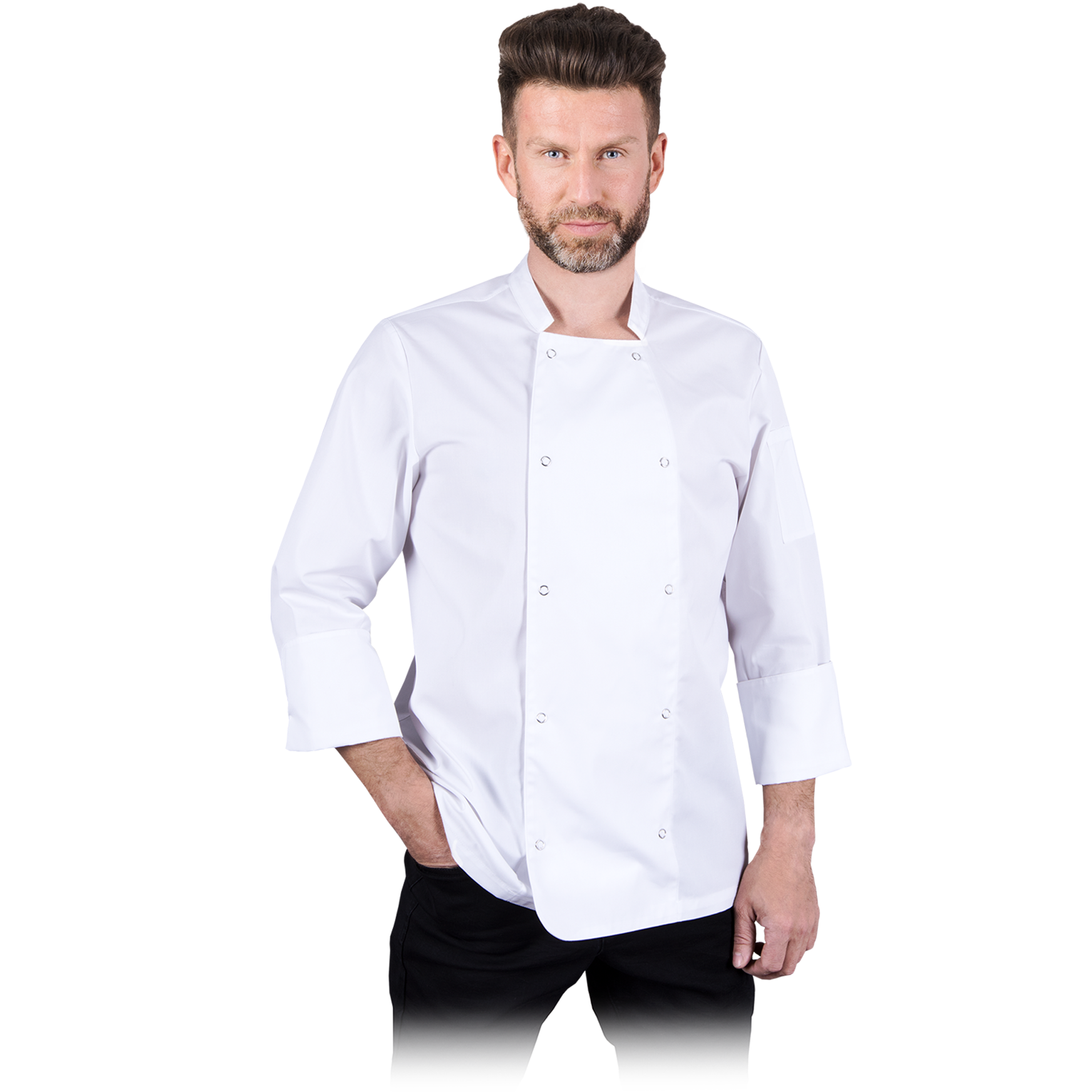 High quality chef jacket with long sleeves. Fastens with buttons.