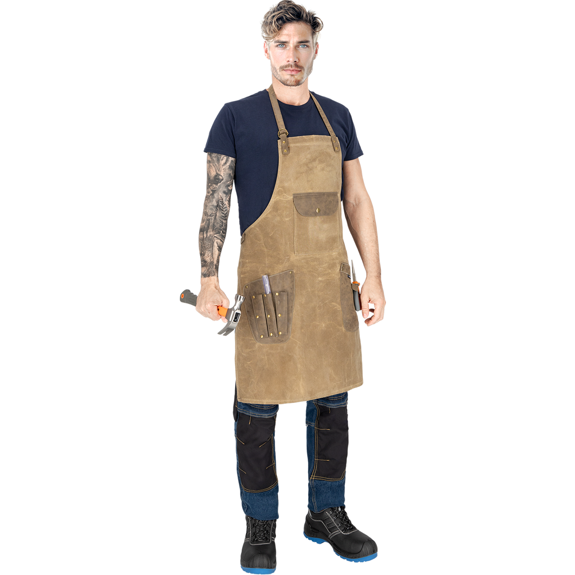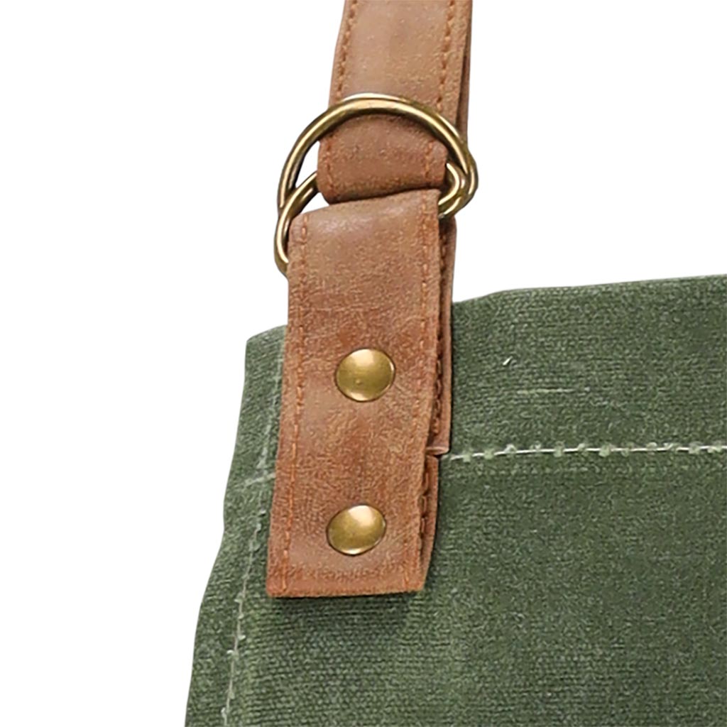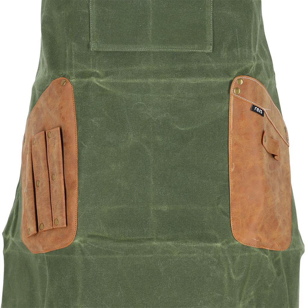 This apron is made of durable waxed canvas fabric, which consists of 70% cotton and 30% polyester. The fabric ensures long-term durability and resistance to various conditions, perfect for intensive daily use. The artificial PU leather inserts not only give the apron an elegant look, but also increase its wear resistance.