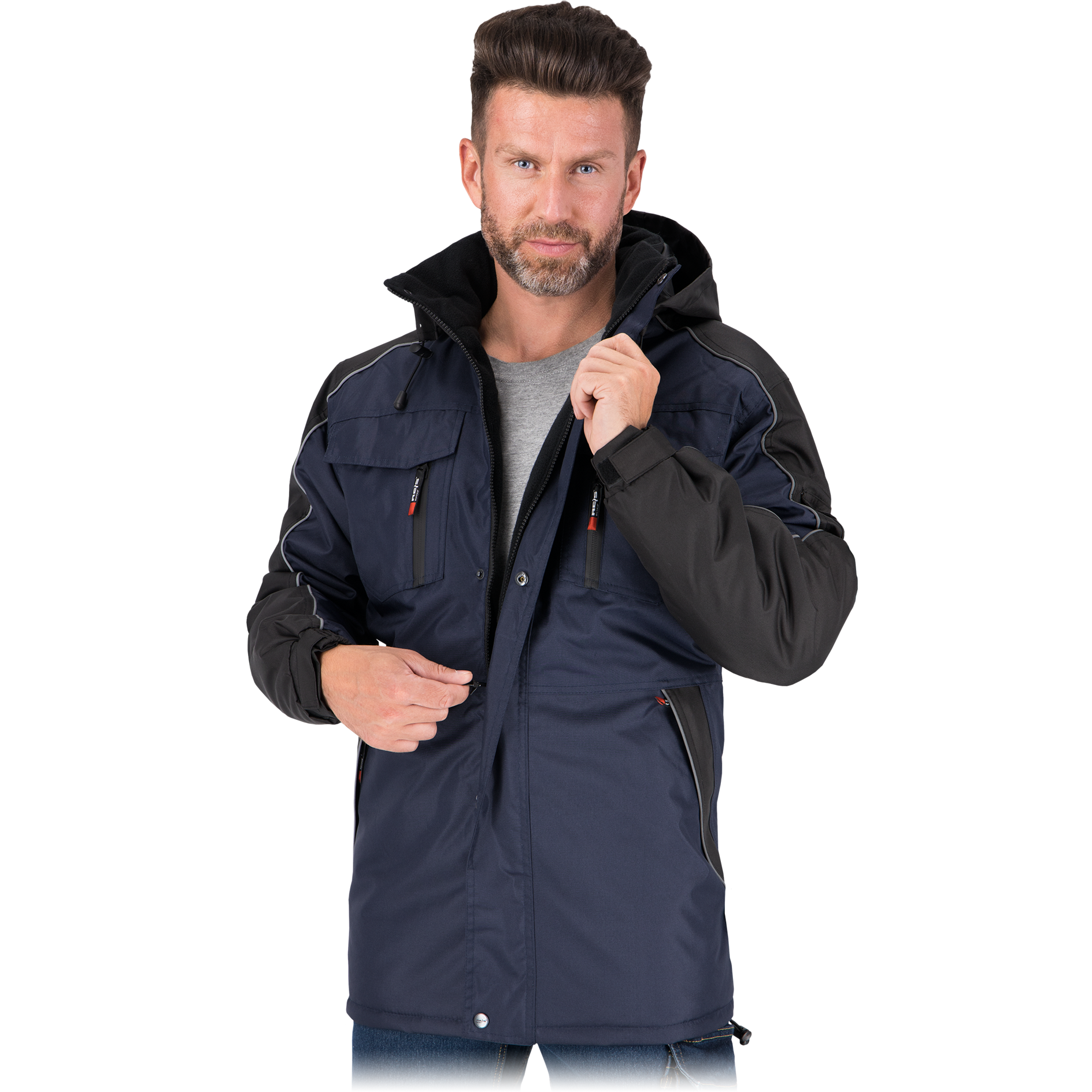 Warm winter men's work jacket. It is made of strong and light fabric, so it is comfortable to wear when doing various jobs in cool weather. There is a hood that protects the head from wind and rain.