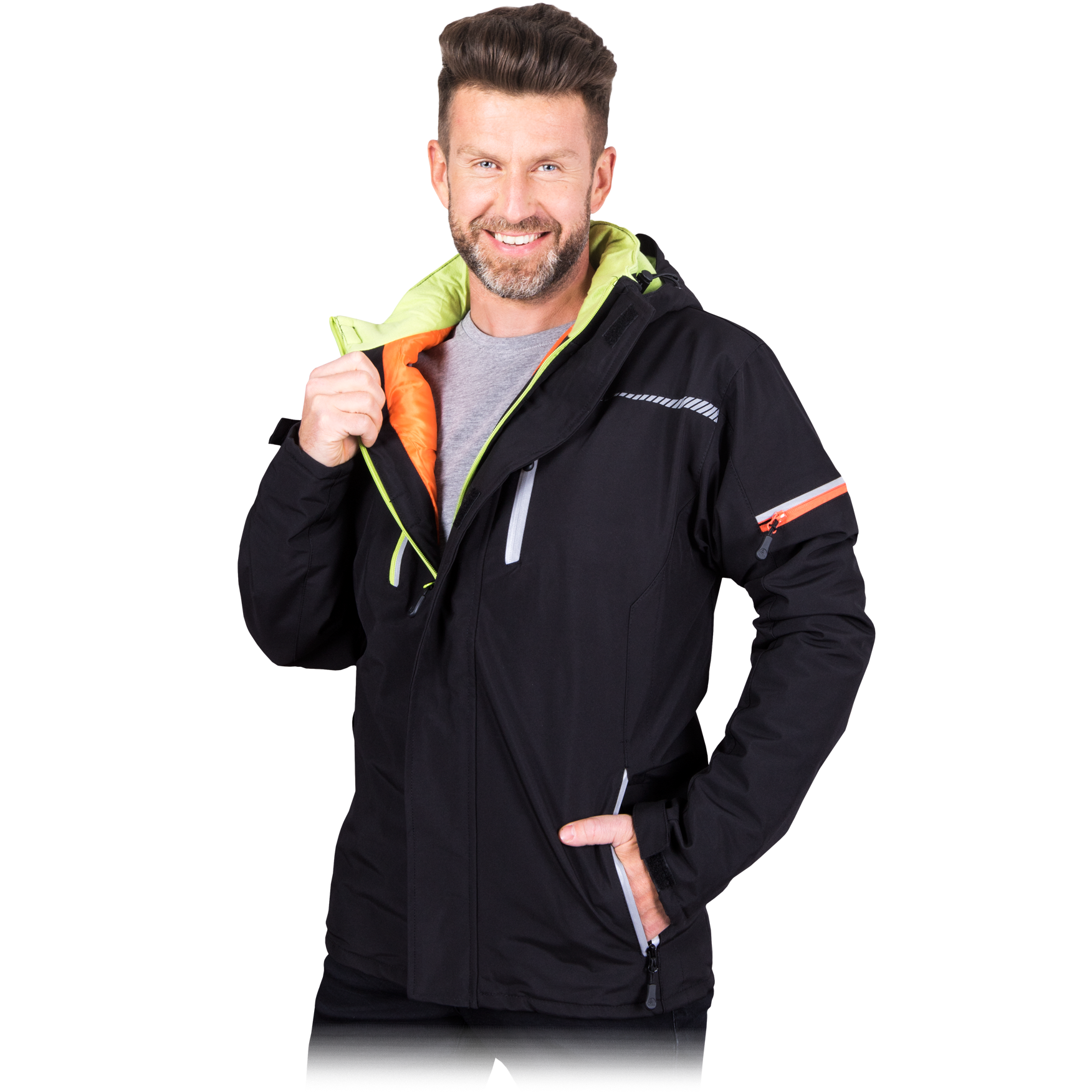 Comfortable and strong men's jacket (Soft Shell). Perfect for both casual and work wear. Heated, has comfortable pockets and reflective elements.