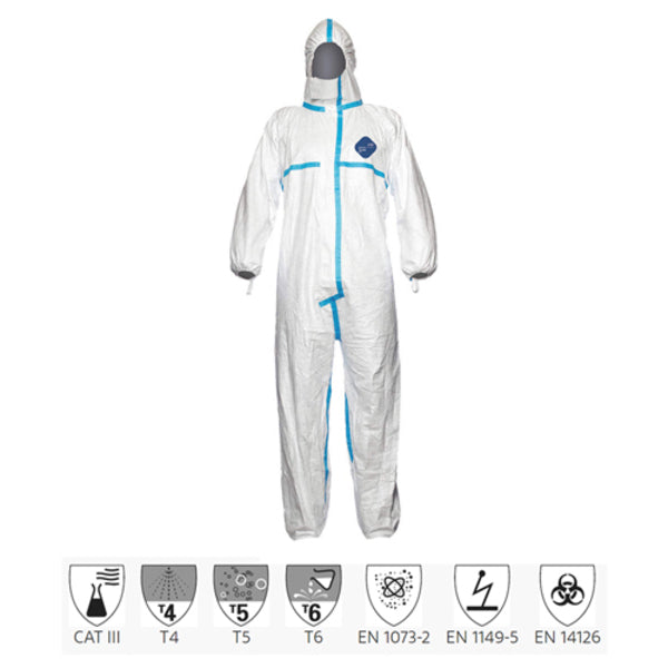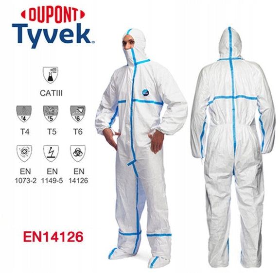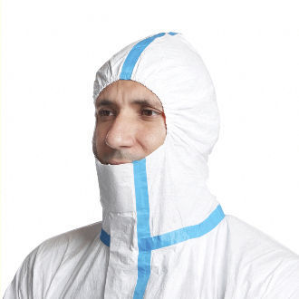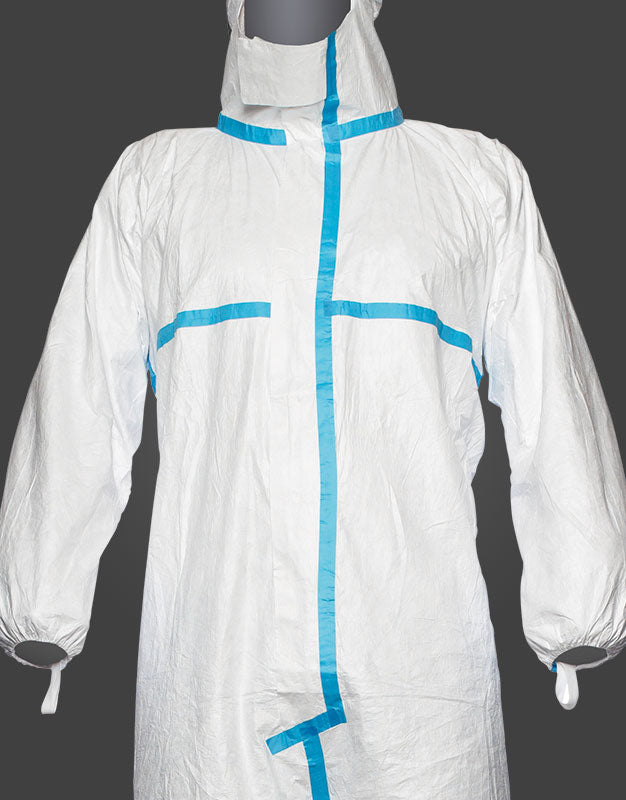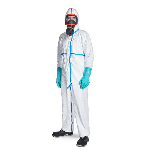 The coverall is suitable for use in all levels of explosive environments. The coverall does not contain halogens, so after use it can be disposed of using standard means. The coverall does not emit fibrous particles, so it is suitable for work in clean rooms. Can be sterilized. Three-piece hood of the protective coverall with elastic closure at the face. Perfect for use with respiratory protection. Allows you to move your head freely in all directions without reducing the field of vision. Stitched and additionally taped seams, elastic cuffs and ankles, elastic waist band, zipper made of TYVEK® material provides the same protection as a coverall, zipper protected by a flap, rubber thumb loops attached to the cuffs. Loops are great for hands-on work. The protective coverall protects against small concentrations of inorganic chemical substances, liquid aerosols, solid substances of biological origin, solid particles larger than 1 µm, radioactive dust. Type of chemical protection: 4B+5+6.
