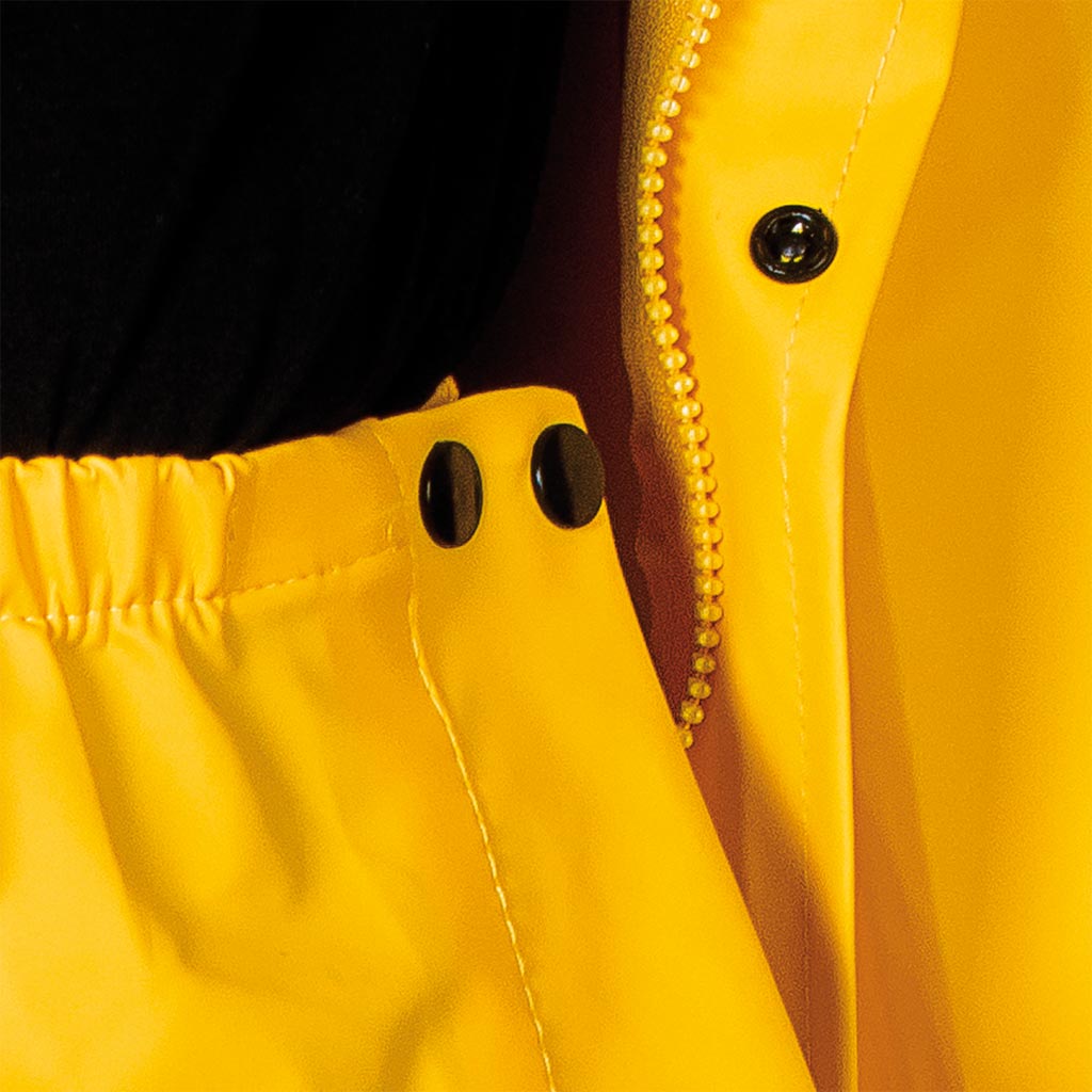 Bottom with stretchy rubber. Additional snaps at waist level for 'fat' adjustment. Expands the bottom of the pants to facilitate the wearing of rubber boots.Ideal for bad weather