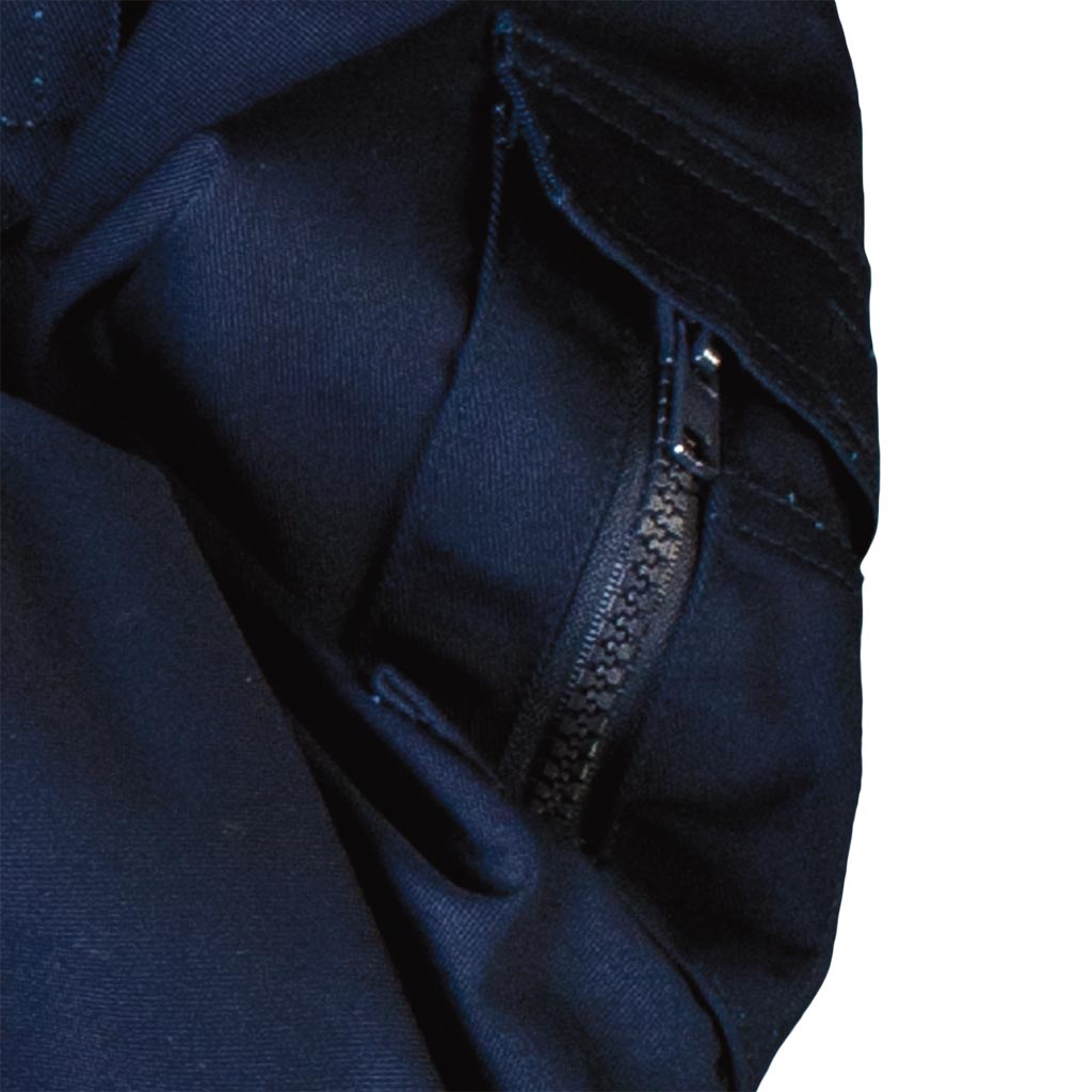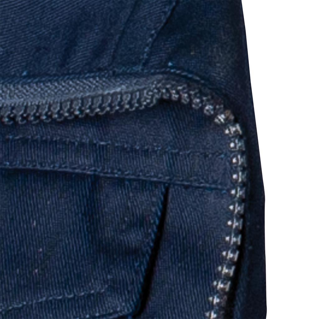 - two front pockets with zippers and two lower pockets with zippers