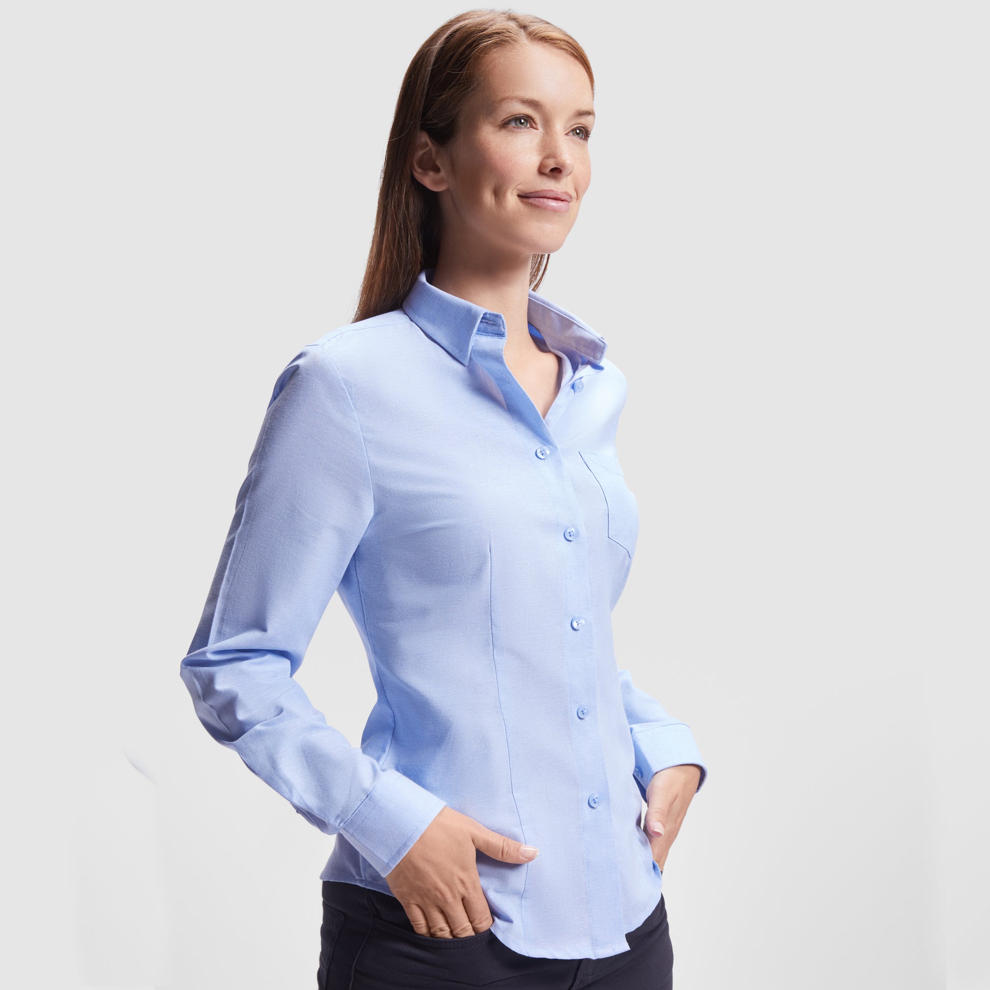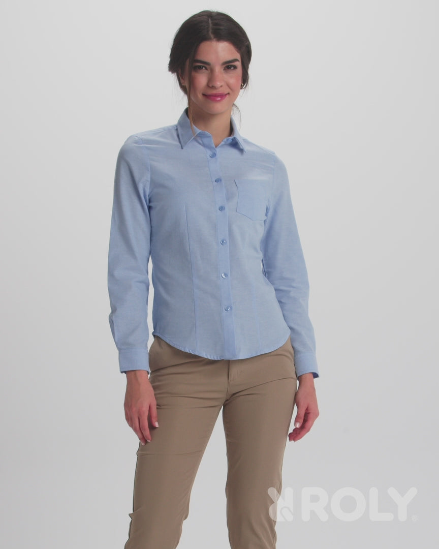 Šie moteriški marškiniai yra puikus pasirinkimas ieškančioms elegancijos ir komforto darbo aplinkoje ar kasdieniam dėvėjimui. Prigludęs siluetas su įsiuvais priekyje ir nugaroje suteikia dailią formą, o Oxford audinys (70% medvilnė, 30% poliesteris, 140 g/m²) užtikrina patvarumą ir lengvą priežiūrą.