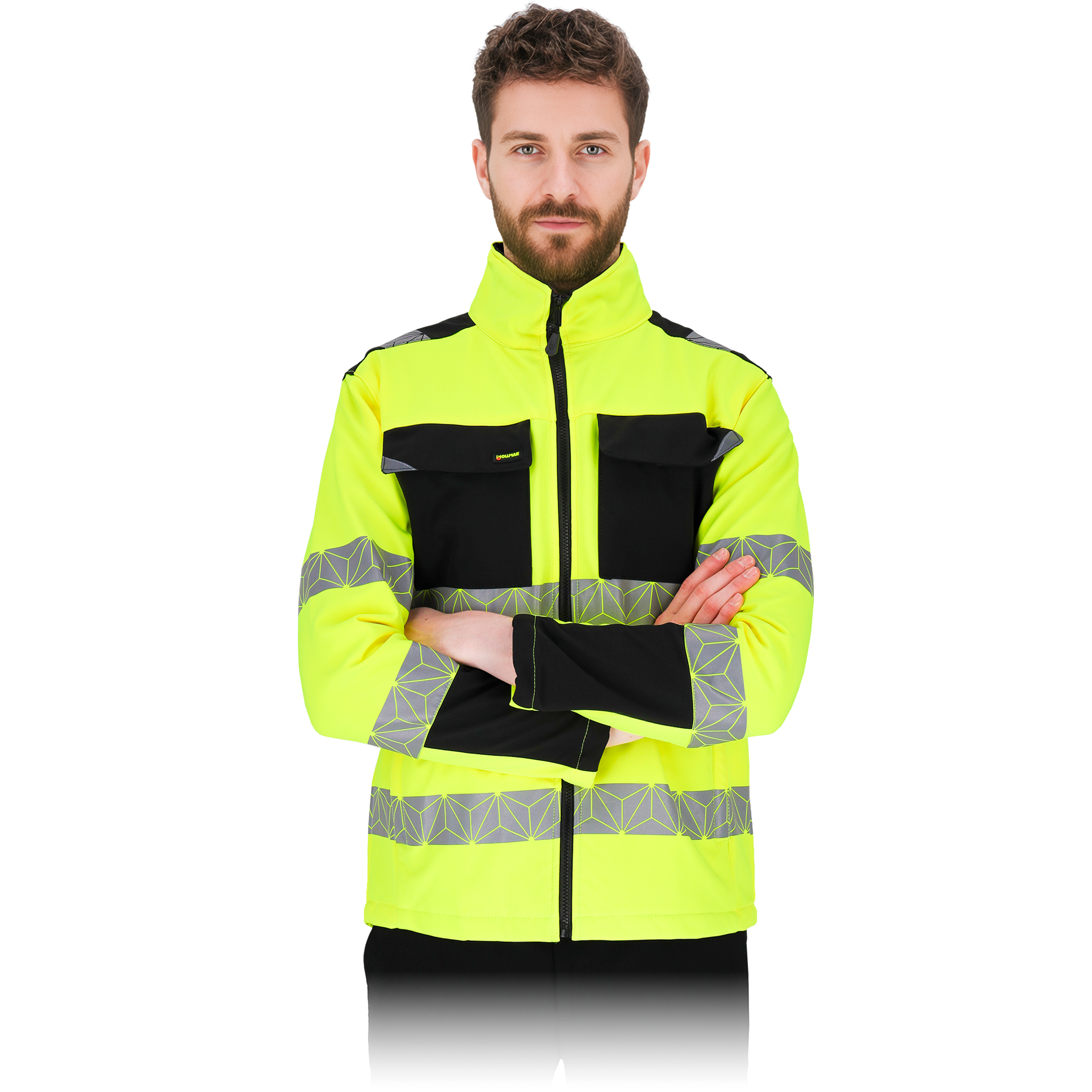 Padidinto matomumo, funkcionalus ir patogus švarkas darbui lauke įvairiomis oro sąlygomis. Softshell tipo medžiaga - ypač elastinga, neperpučiama vėjo bei apsauganti nui drėgmės.