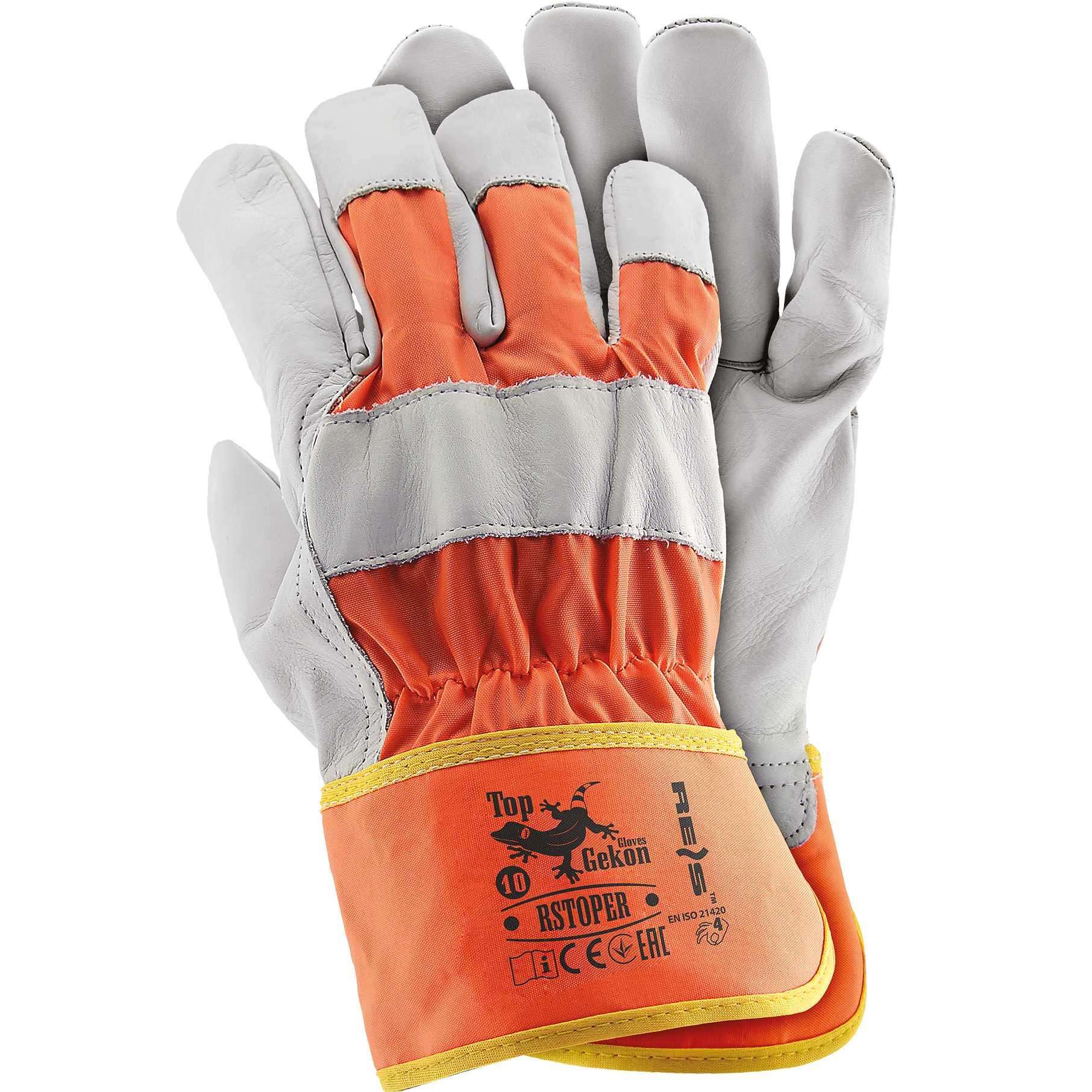 Protective gloves for work, reinforced with natural cowhide. The upper part of the gloves is made of a light red fabric that perfectly fits the hand. The entire plane of the palm is covered with a leather part, so it perfectly protects against mechanical impact.