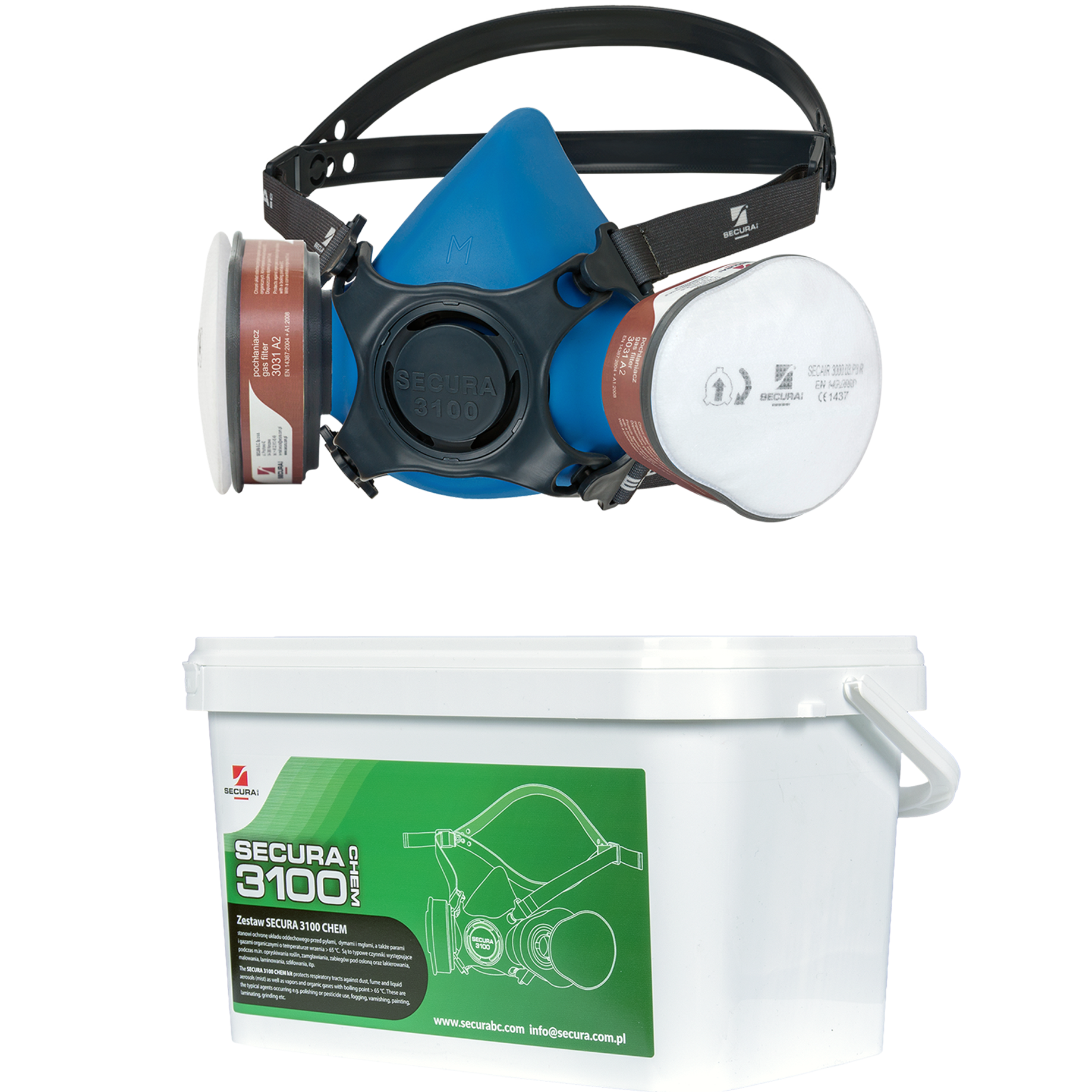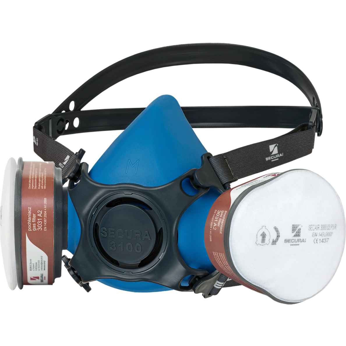 - the kit includes: SECURA 3100 silicone half-mask, two 3031 A2 absorbers, two 3000.03 P3 R filters