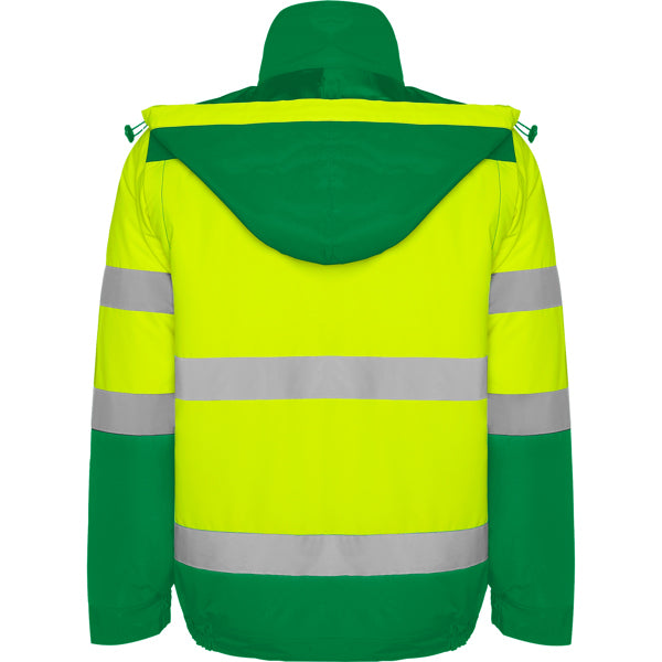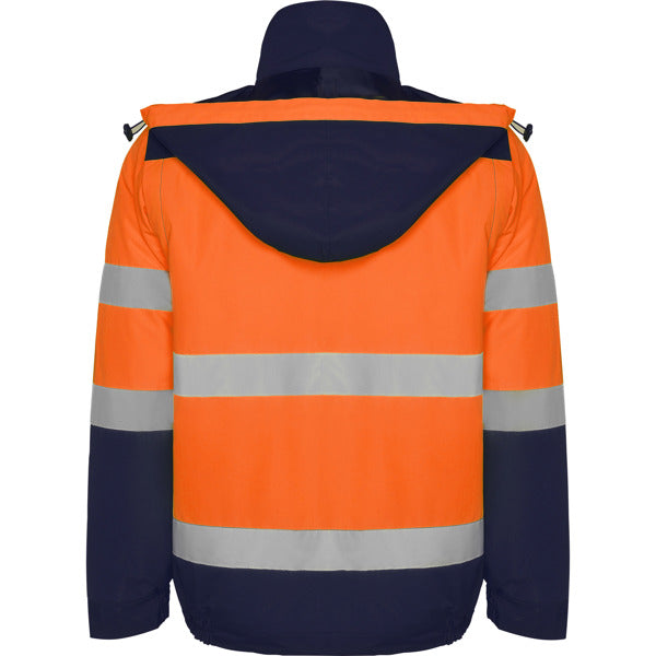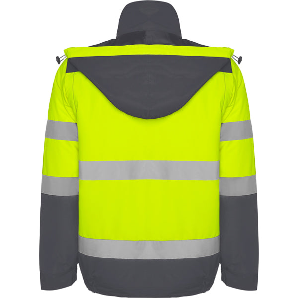 This men's high-visibility jacket (parka) is made of two-tone material and is perfect for use in various weather conditions, as it is waterproof and windproof. It has the following key features: