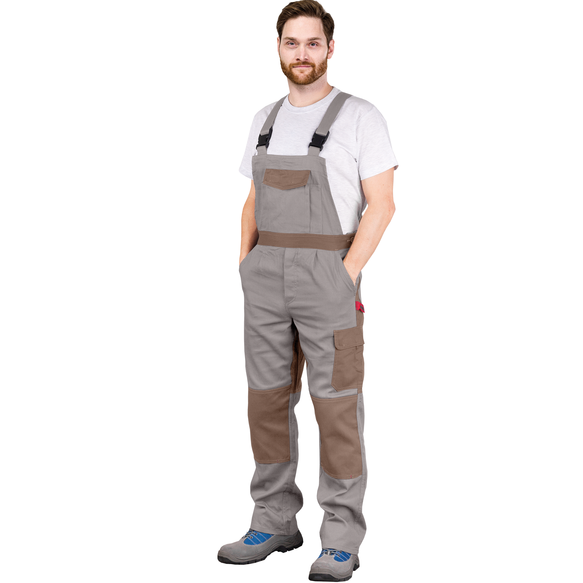 Comfortable and strong work pants with braces, made of special strong fabric (100% cotton). Many convenient pockets are provided. Does not fade with intensive use and washing. Additional reinforced places on the roads. Adjustable waist.