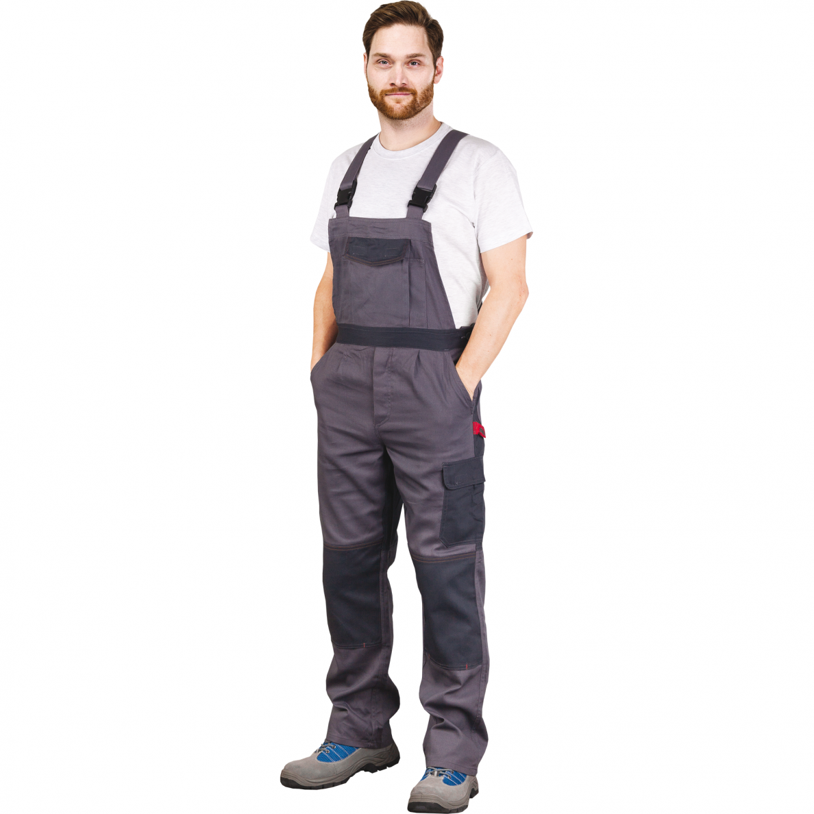 Comfortable and strong work pants with braces, made of special strong fabric (100% cotton). Many convenient pockets are provided. Does not fade with intensive use and washing. Additional reinforced places on the roads. Adjustable waist.