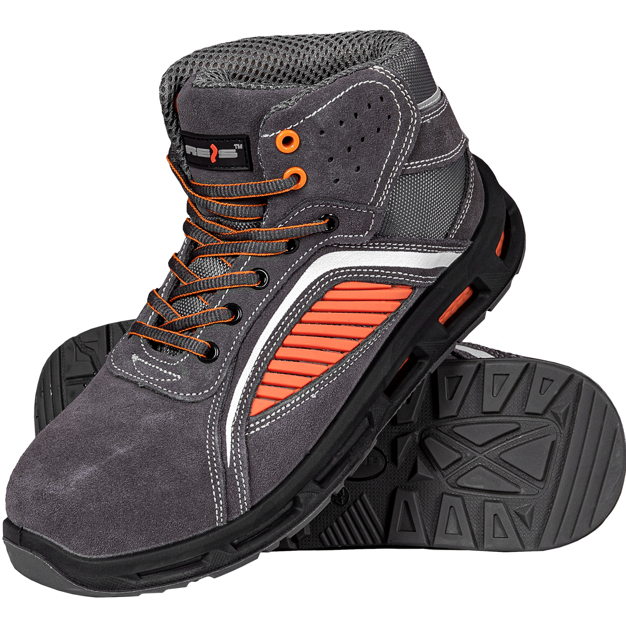 Comfortable and durable work boots made of pressed leather. With material inserts. The shoes have a double polyurethane sole. Built-in toe protection against falling objects. Additional reinforced construction at the toes and heel.