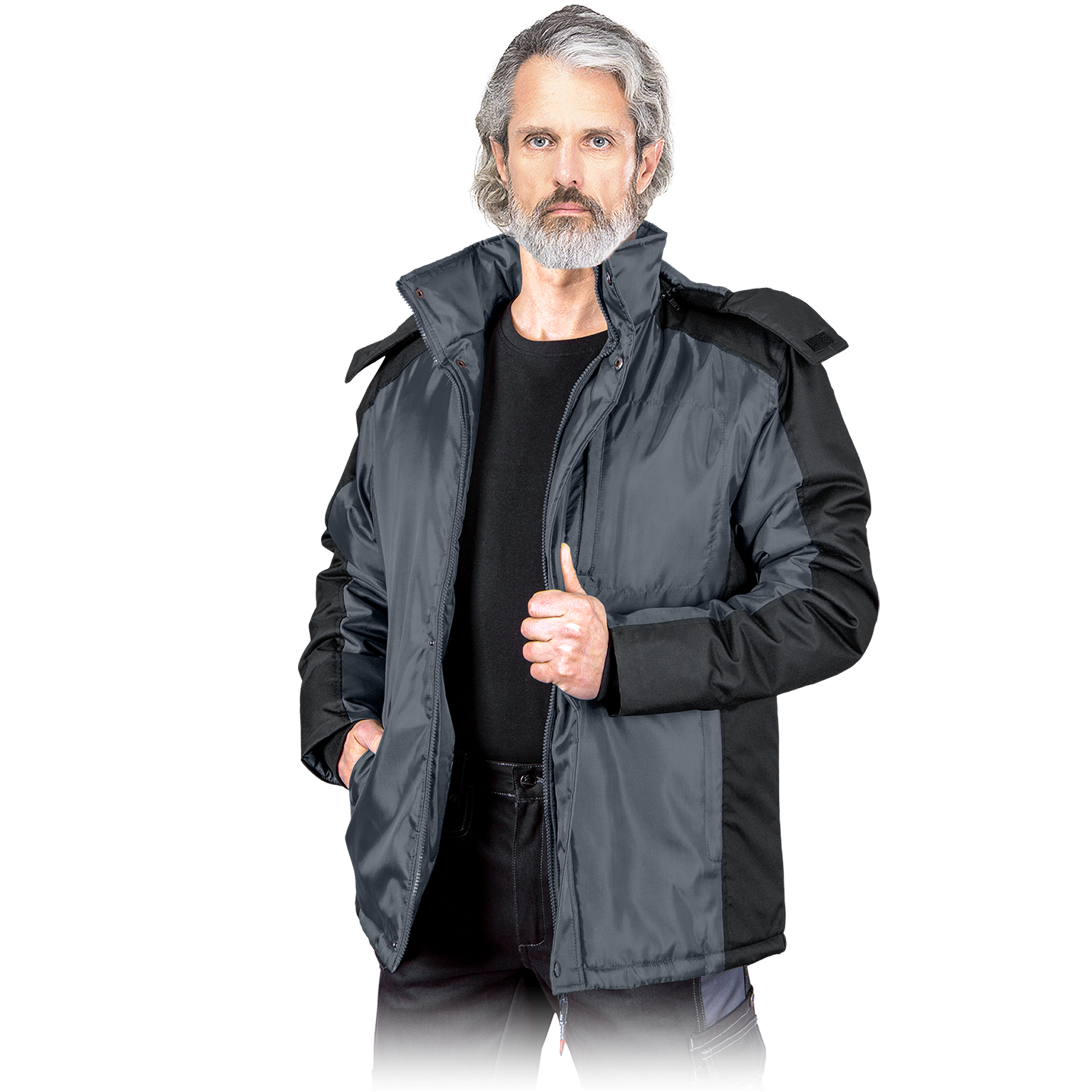 Warm winter men's work jacket. It is made of strong and light fabric, so it is comfortable to wear when doing various jobs in cool weather. There is a hood that protects the head from wind and rain.