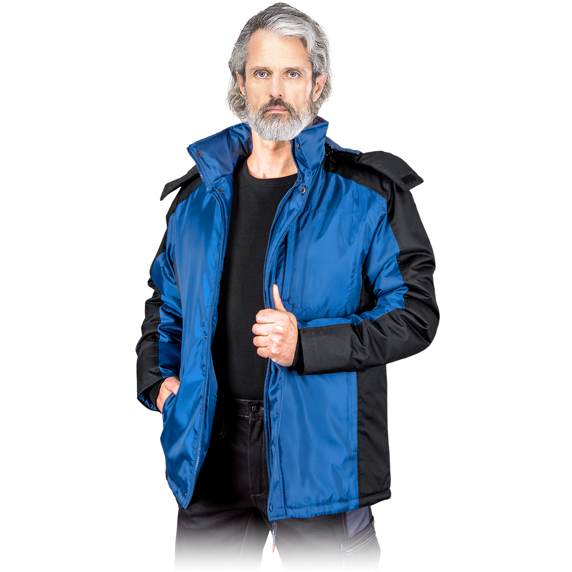 Warm winter men's work jacket. It is made of strong and light fabric, so it is comfortable to wear when doing various jobs in cool weather. There is a hood that protects the head from wind and rain.