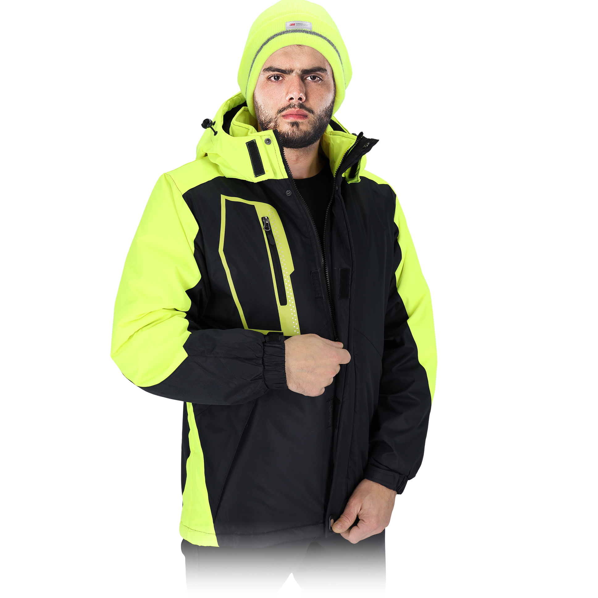 Warm winter men's work jacket. It is made of strong and light fabric, so it is comfortable to wear when doing various jobs in cool weather. There is a hood that protects the head from wind and rain.