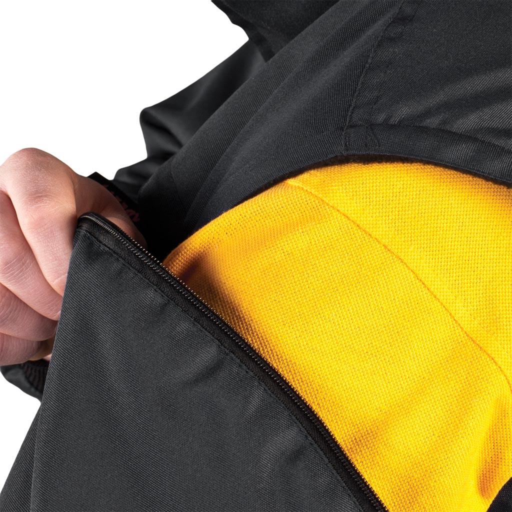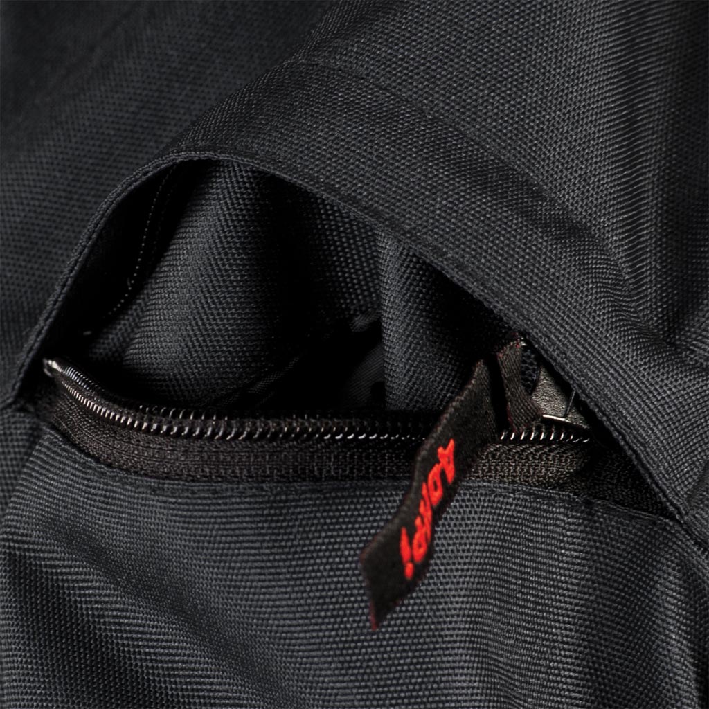 - Fastens with a zipper