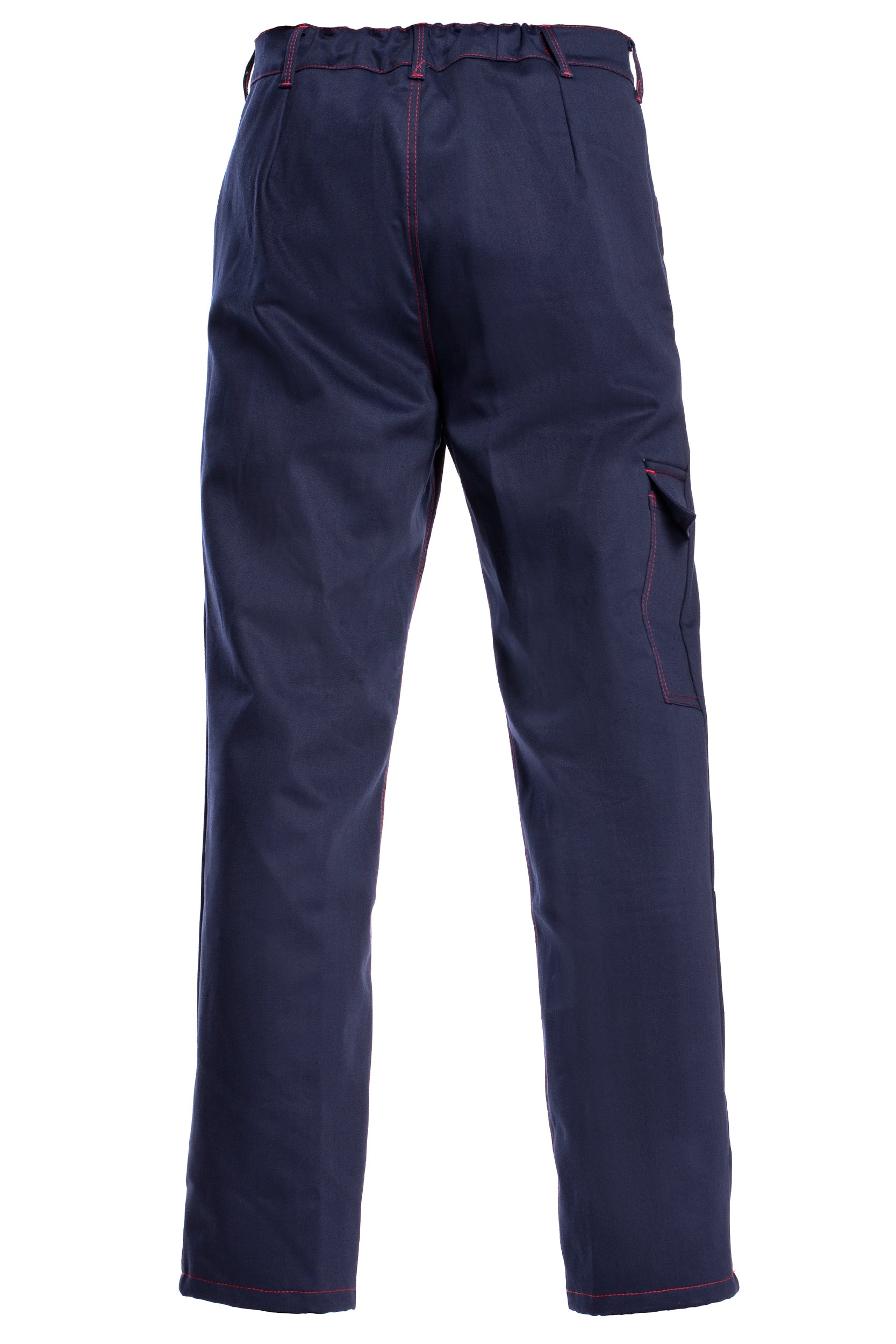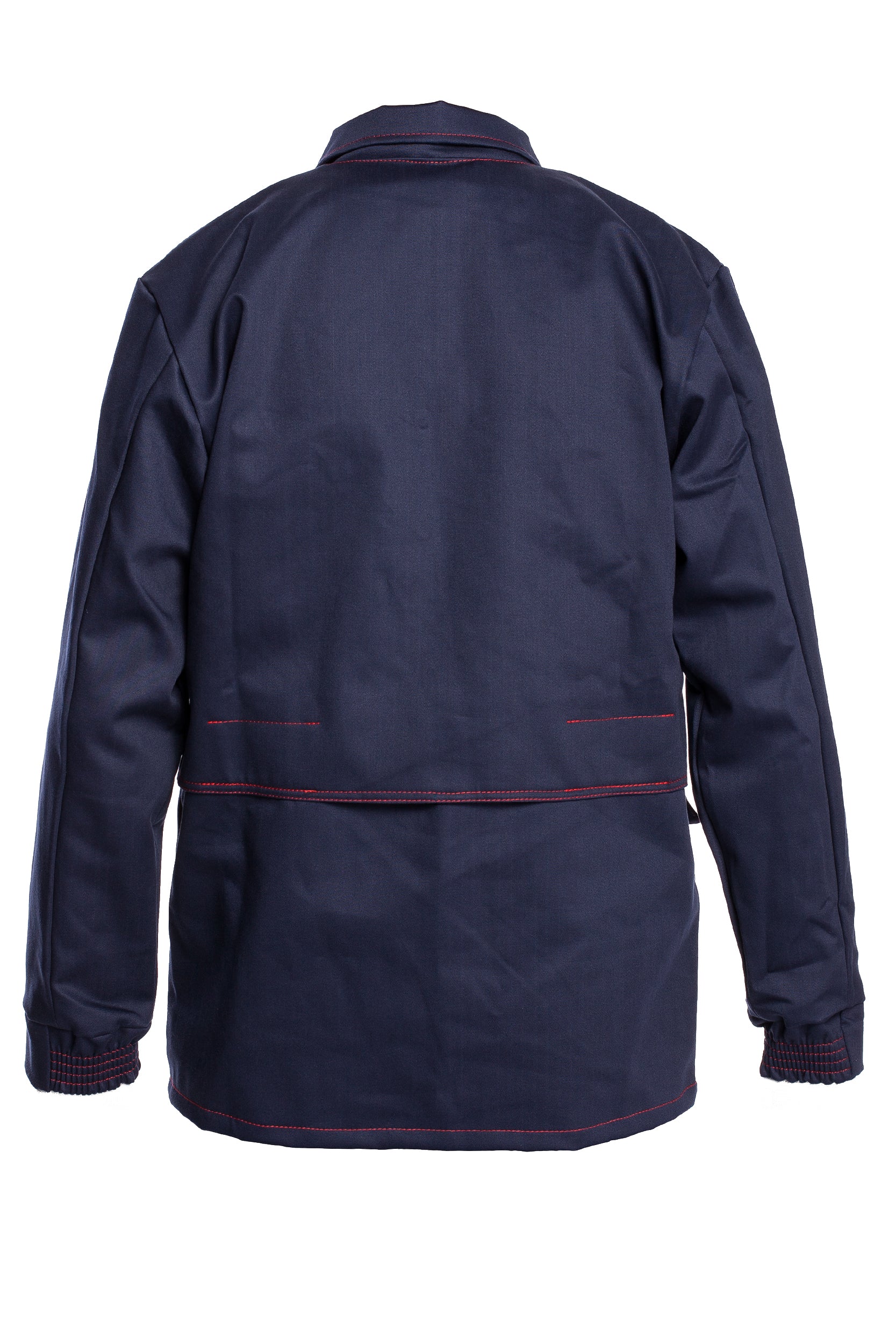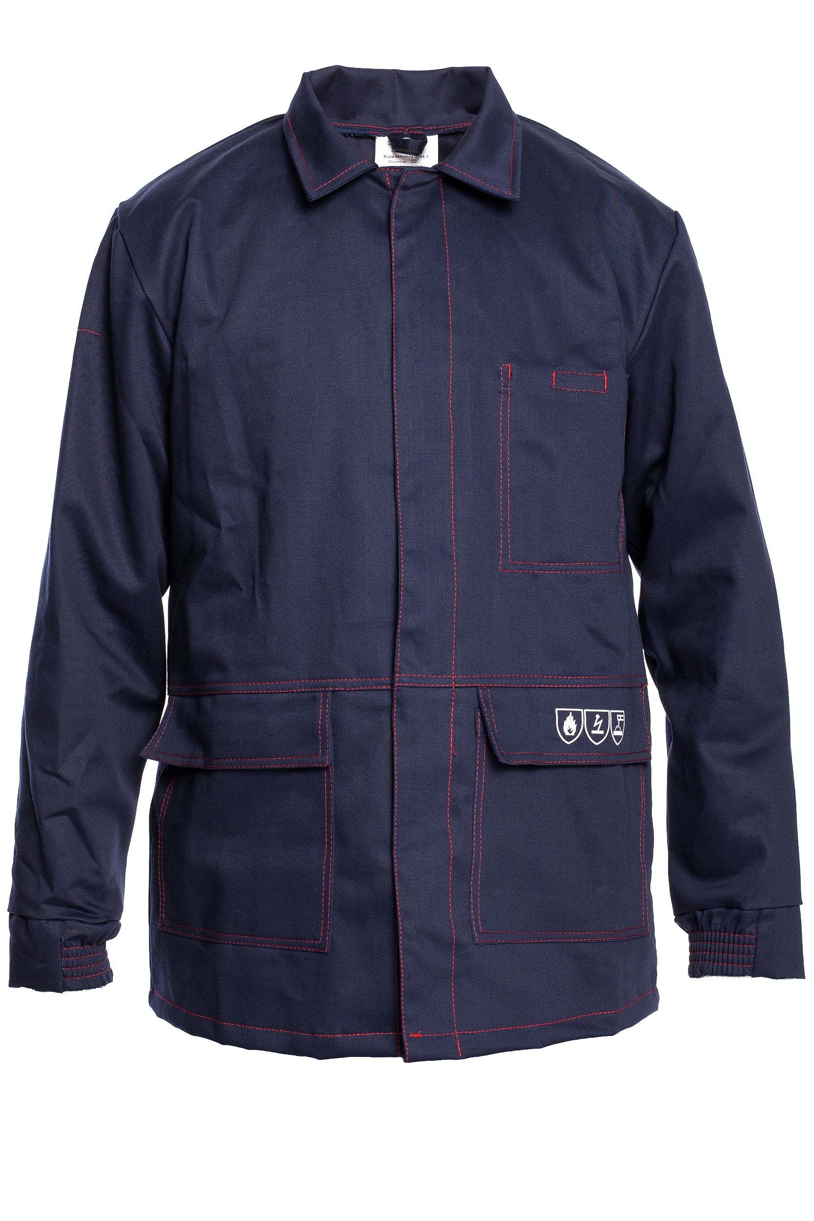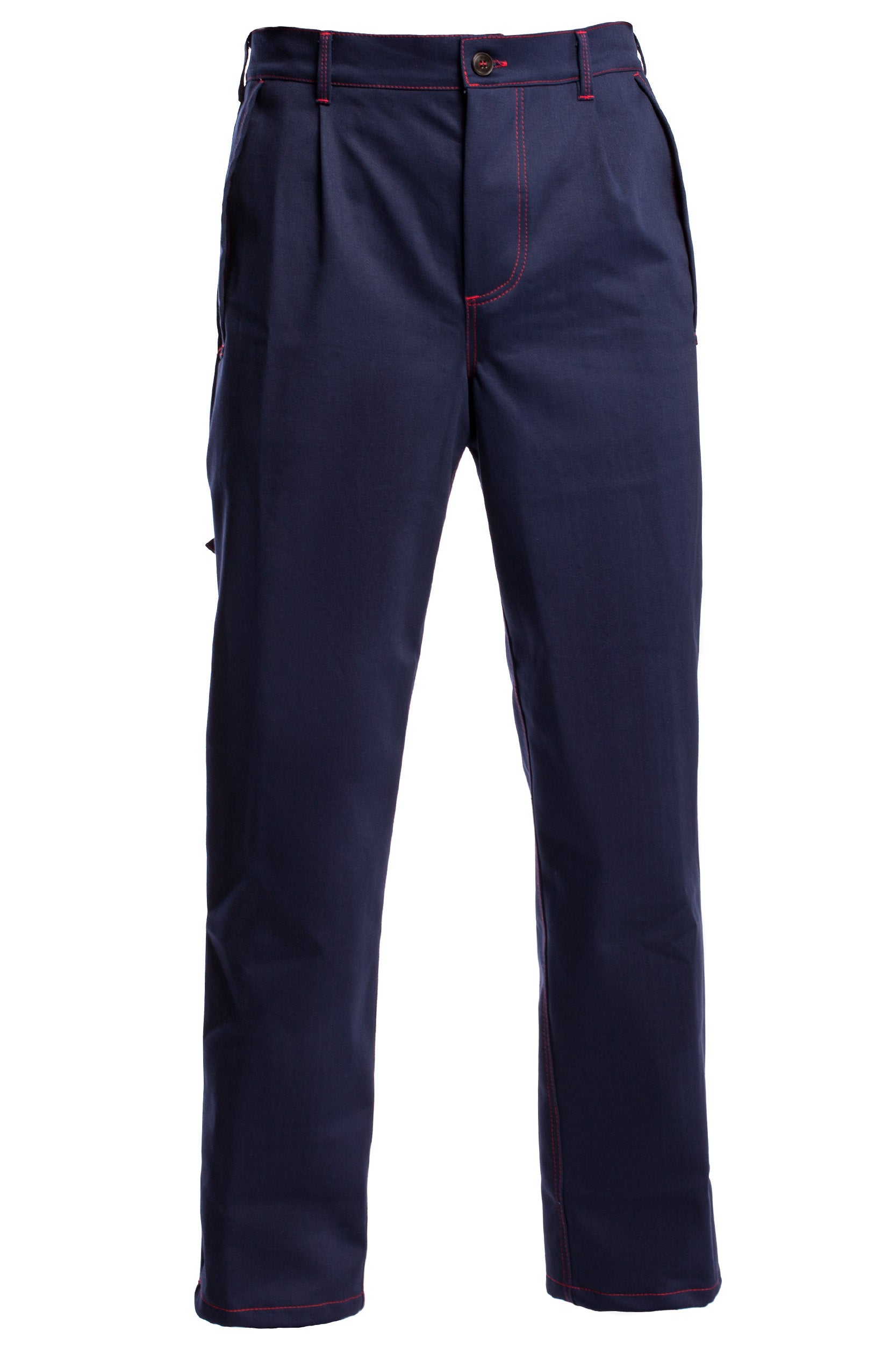These clothes are made from a high quality material composition: 99% cotton and 1% antistatic carbon thread. Their weight is 350g/m2 and the shrinkage is only 2-3%. These garments are dark blue in color with contrasting flame retardant threads for high resistance to rips, tears and abrasions.