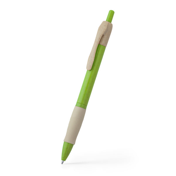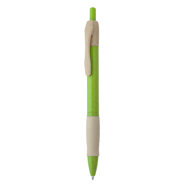 This ballpoint pen is made of wheat fiber and ABS plastic with a soft grip for comfortable writing. It writes in blue ink. The combination of materials helps reduce plastic use, making it a more environmentally friendly choice.