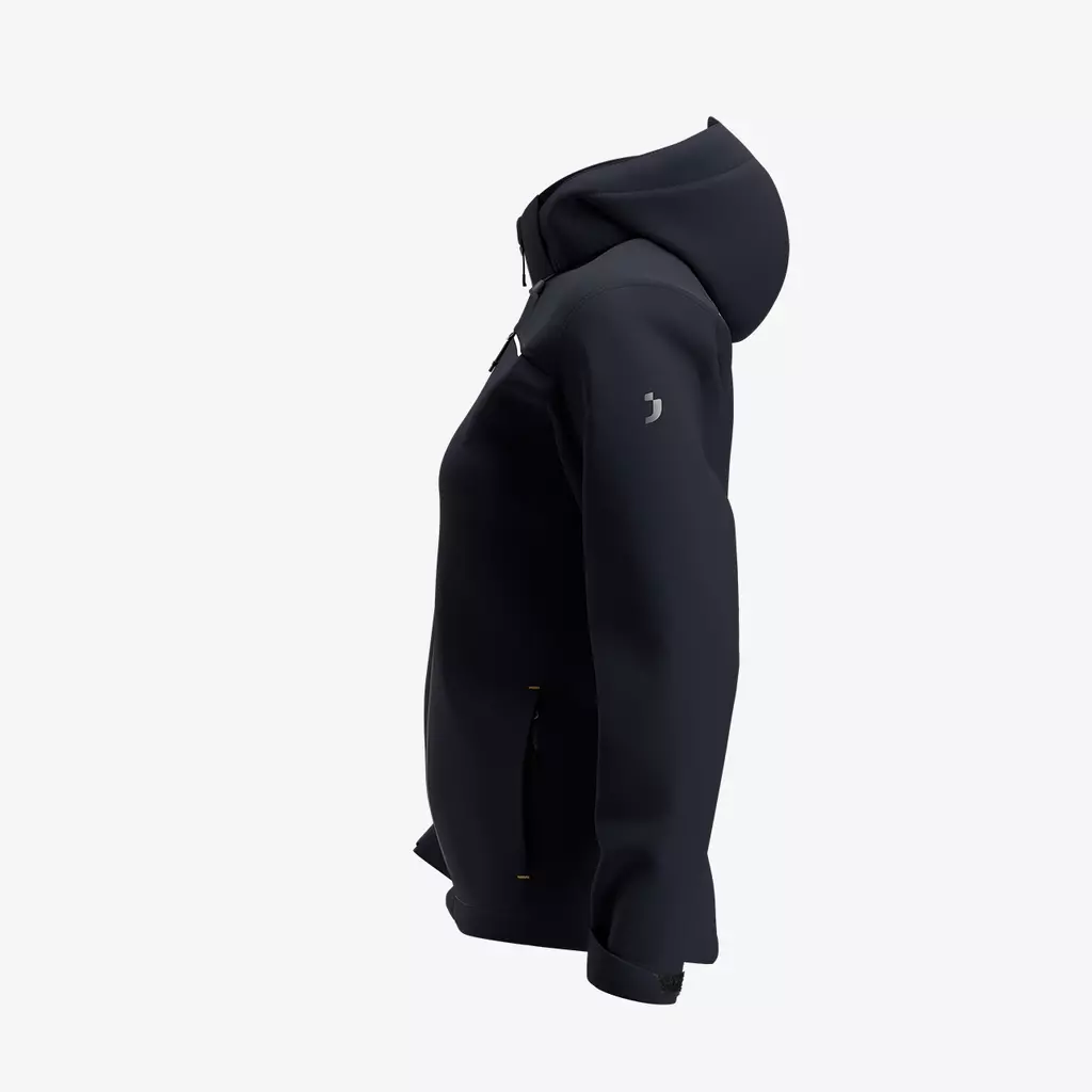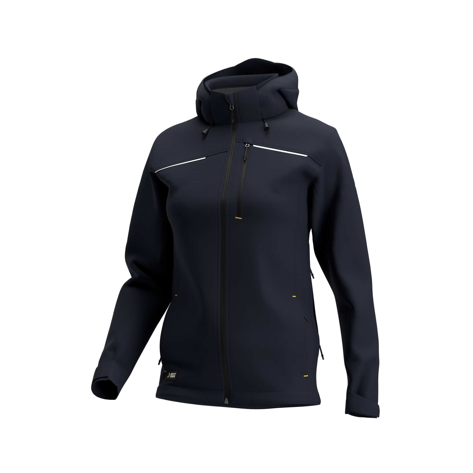 safetWaterproof, windproof and breathable women's softshell jacket for maximum freedom of movement. This flexible softshell jacket is made of waterproof, windproof and breathable materials for comfort and protection. The jacket has practical pockets, a removable hood, storm flap and chin guard. It also features reflective design elements and zippered underarm ventilation. The jacket has a feminine cut that emphasizes the figure.