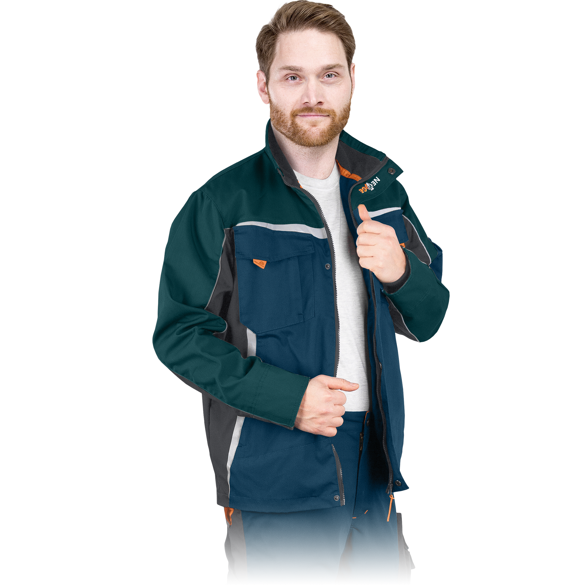 Sturdy, enhanced resistance men's work jacket. Made from highly resistant fabric for comfortable handling of difficult jobs in various positions. Convenient side pockets are additionally designed, the most important places are reinforced, there is a pocket for keeping a mobile phone, strong and reliable zippers are used.