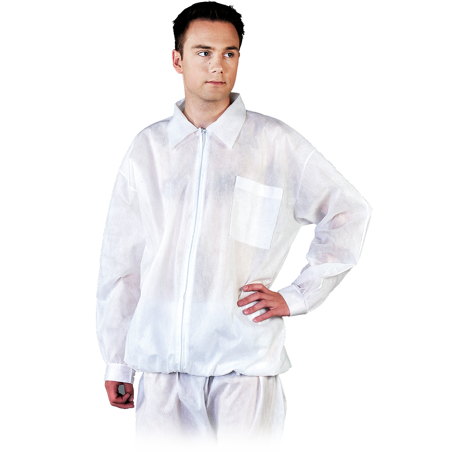Jacket made of polypropylene, with long sleeves. Fastens with a zipper. Suitable for use in food production, chemistry, cosmetics. Density: 50 g/m2.
