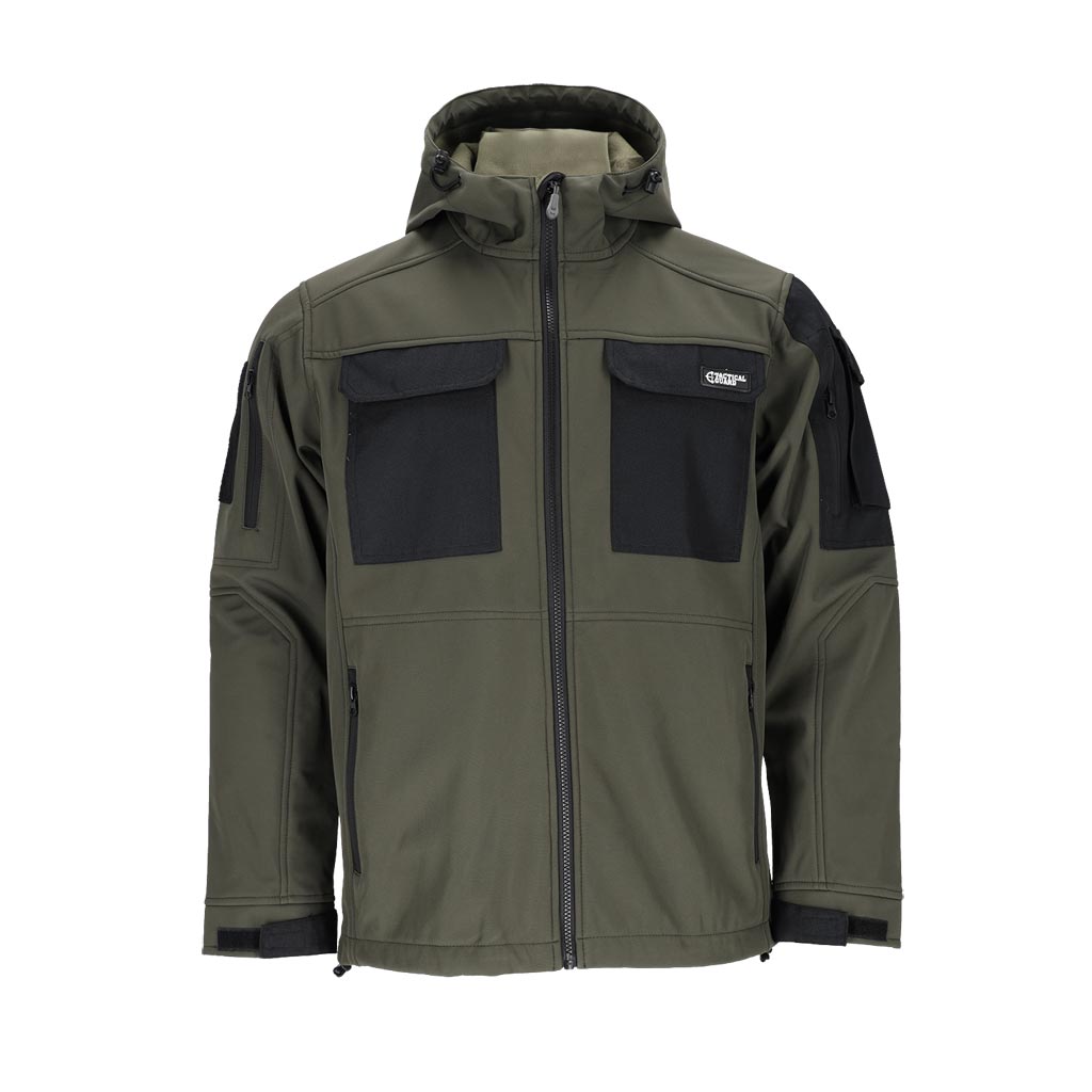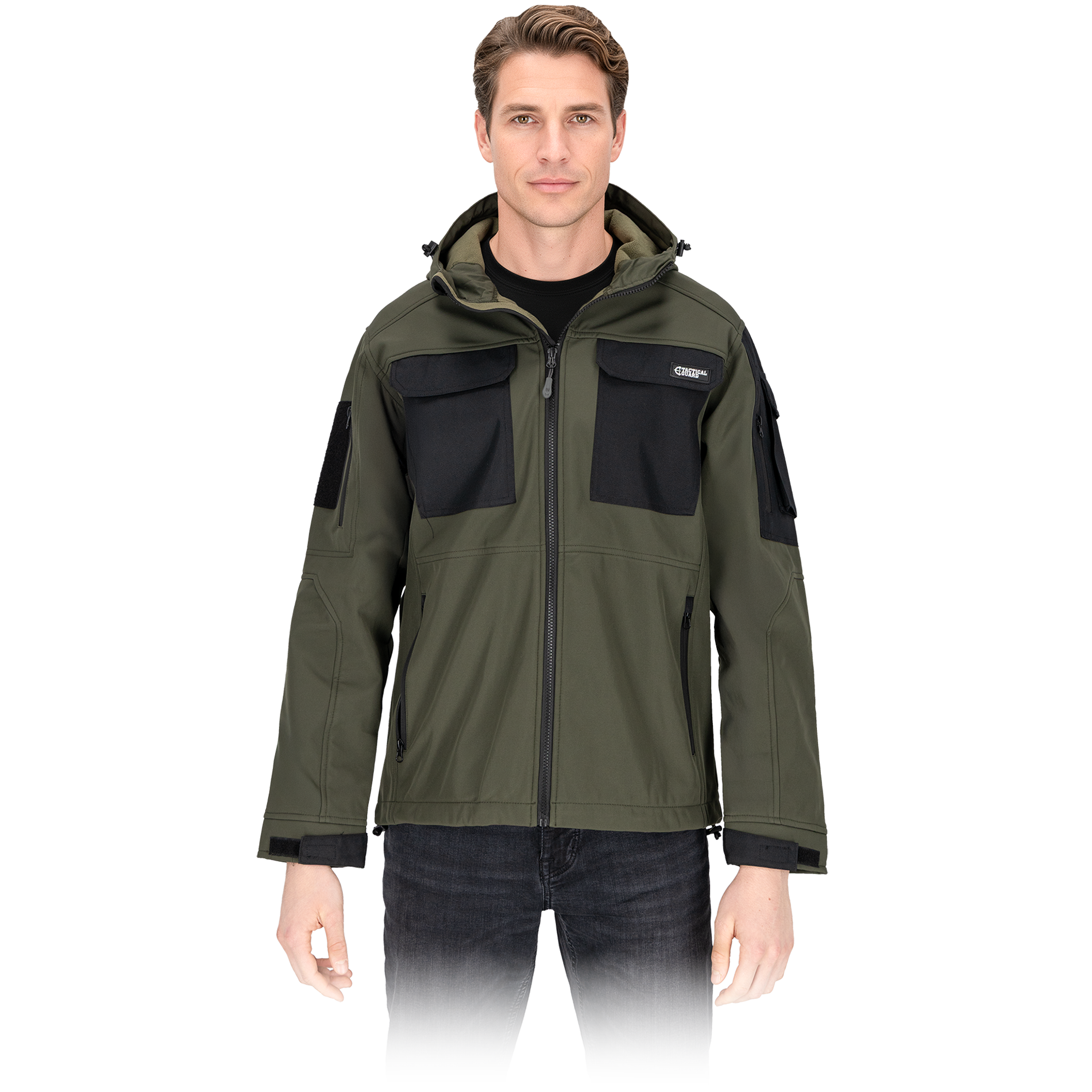 Trijų sluoksnių softshell audinys: 96% poliesteris, 4% elastanas su TPU membrana ir flisu (100% poliesteris), 280 g/m²