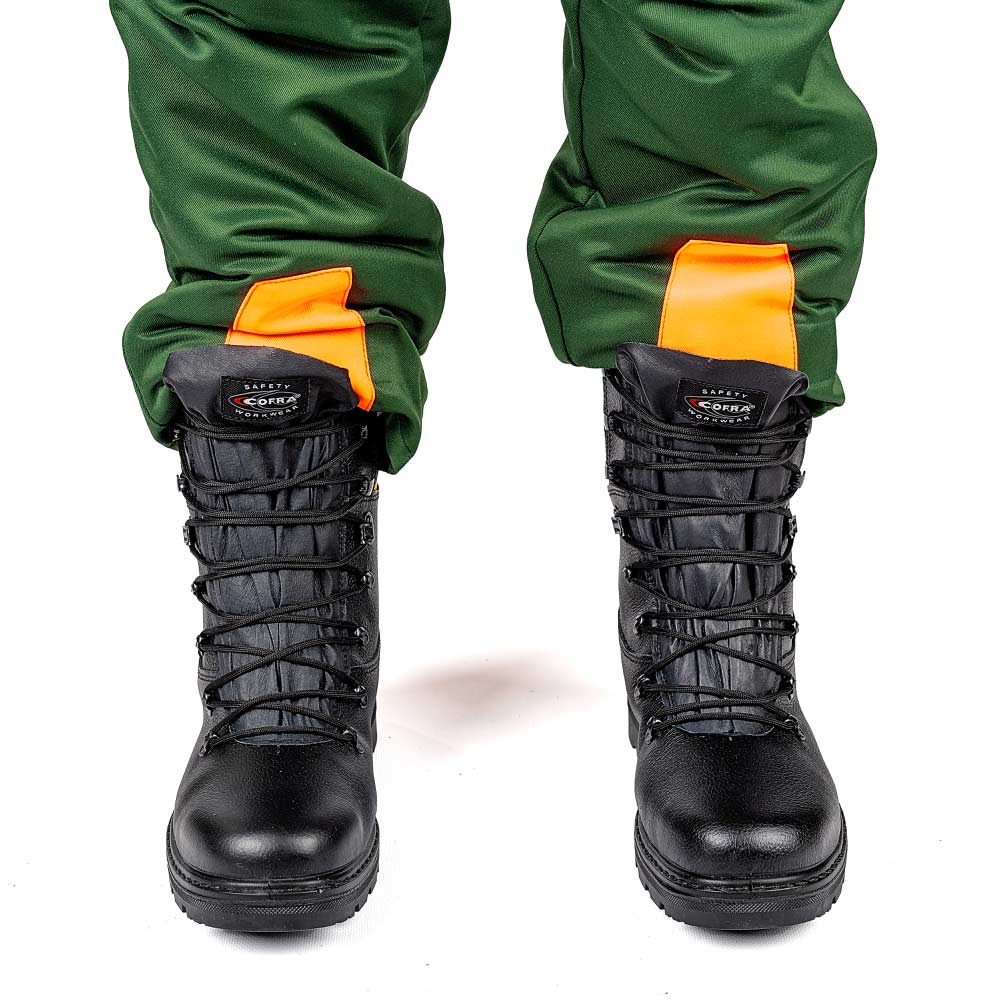- Viršutinis sluoksnis: vandeniui atspari, itin stipri oda su pjūklo apsaugos įdėklu priekinėje dalyje. Susidūrus su pjūklo grandine, specialios pluošto dalelės blokuoja grandinę, iš karto sustabdydamos prietaisą.