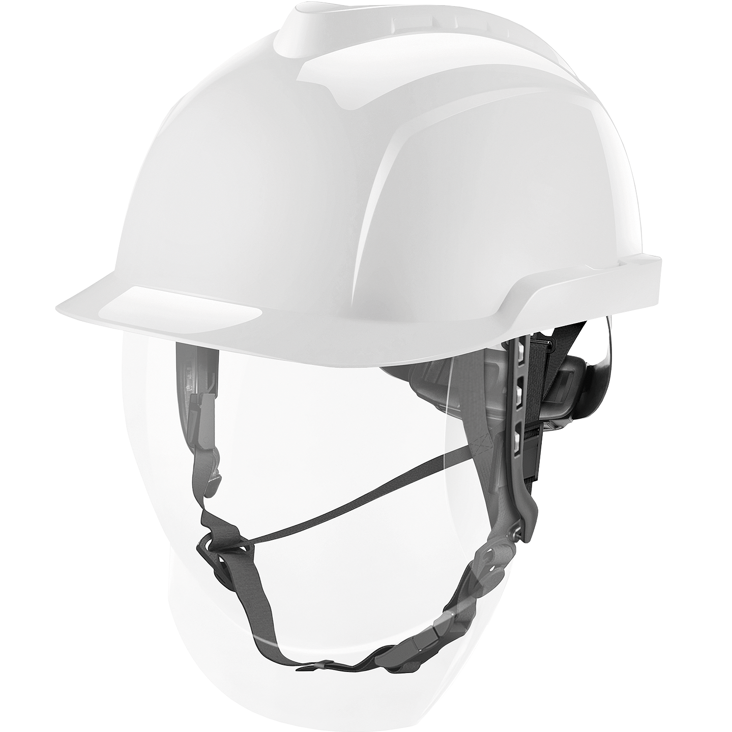 Aukštos kokybės apsauginis elektriko šalmas MSA su priedais, į komplektą įeina: šalmas ir skydelis. Subalansuotas, lengvas ir neventiliuojamas šalmas su Fas-Trac® III sistema, leidžiančia reguliuoti 52-63 cm diapazone su mygtuku ir 6 taškų tvirtinimu.
