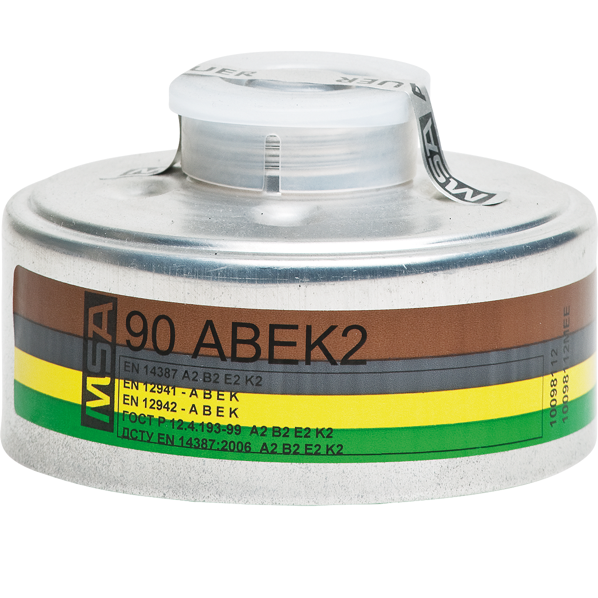 Keičiamas 90 ABEK 2 sugėriklis puskaukėms ir viso veido kaukėms su sriegine jungtimi.