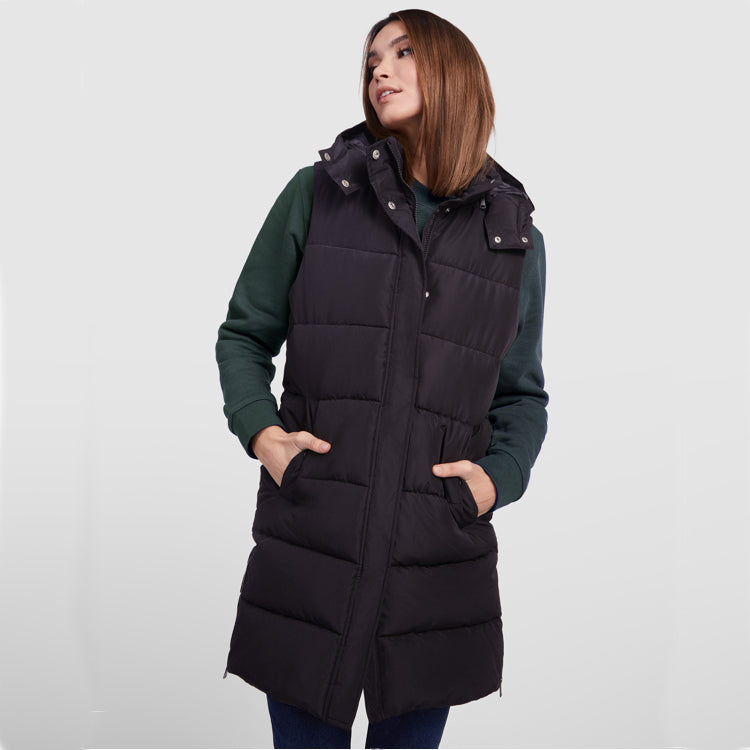 Moteriška pašiltinta liemenė su nusegamu gobtuvu.