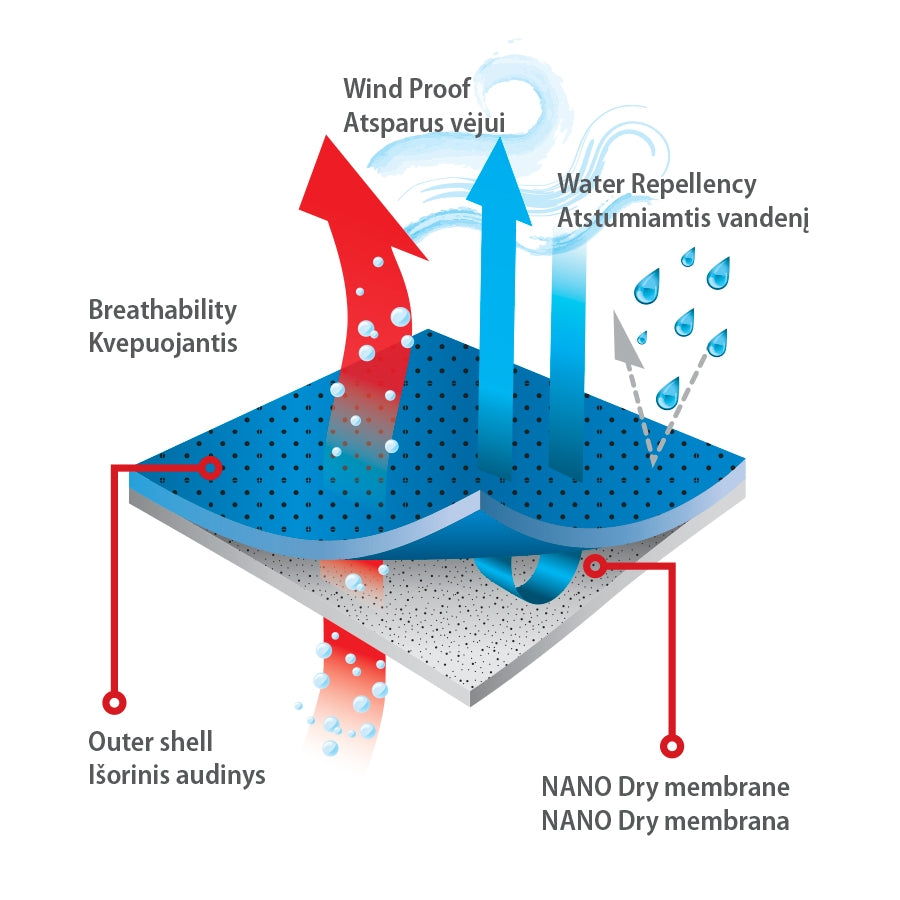 EN 343:2003+A1:2007 – Apsauga nuo lietaus. X – atsparumas vandens prasiskverbimui (3 lygiai: 1 klasė – minimlus lygis; 2 kl. – vidutinis; 3 k.- aukščiausias lygis). Y – Pasipriešinimo laipsnis vandens garų prasiskverbimui (3 lygiai:1 klasė – minimalus lygis; 2 kl. – vidutinis; 3 k.- aukščiausias lygis), rekomenduojamas dėvėjimo sąlygas žiūrėti lentelėje Nr 2.
