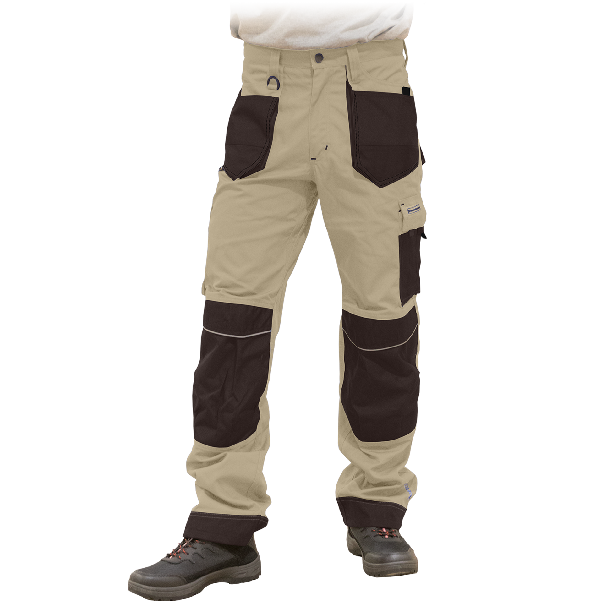 Tvirtos ir atsparios vyriškos darbo kelnės. Pasiūtos iš itin atsparaus audinio, todėl patogu dirbti sudėtingus darbus įvairiose pozicijose. Papildomai suplanuotos patogios šoninės kišenės, sutiprintos svarbiausios vietos, pridėtos specialios kilpos raktams bei darbo įrankiams, yra kišenėlė laikyti mobilų telefoną bei įstatyti kelių apsaugas. Audinys neblunka intensyviai naudojant ir skalbiant, todėl užtikrina komfortą ir saugų darbą įvairiomis sąlygomis. Sustiprintos siūlės užtikrina ilgesnį kelnių tarnavimo laiką.