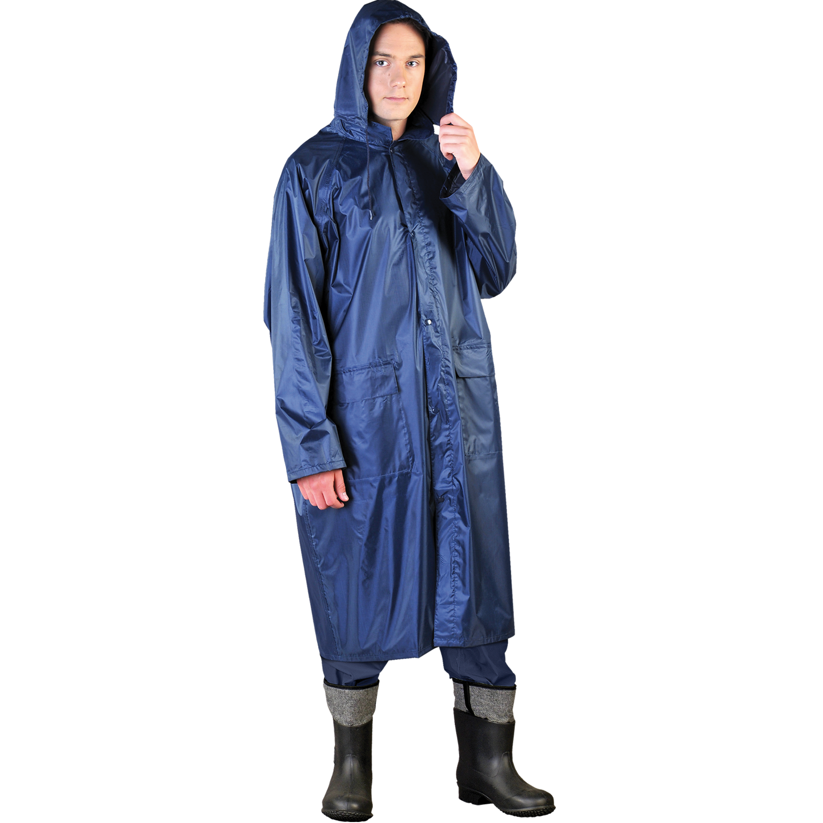 Liataus apsiaustas. Pasiūtas naudojant poliesterį (PCV). Yra kapišonas. Užsegamas užtrauktuku.