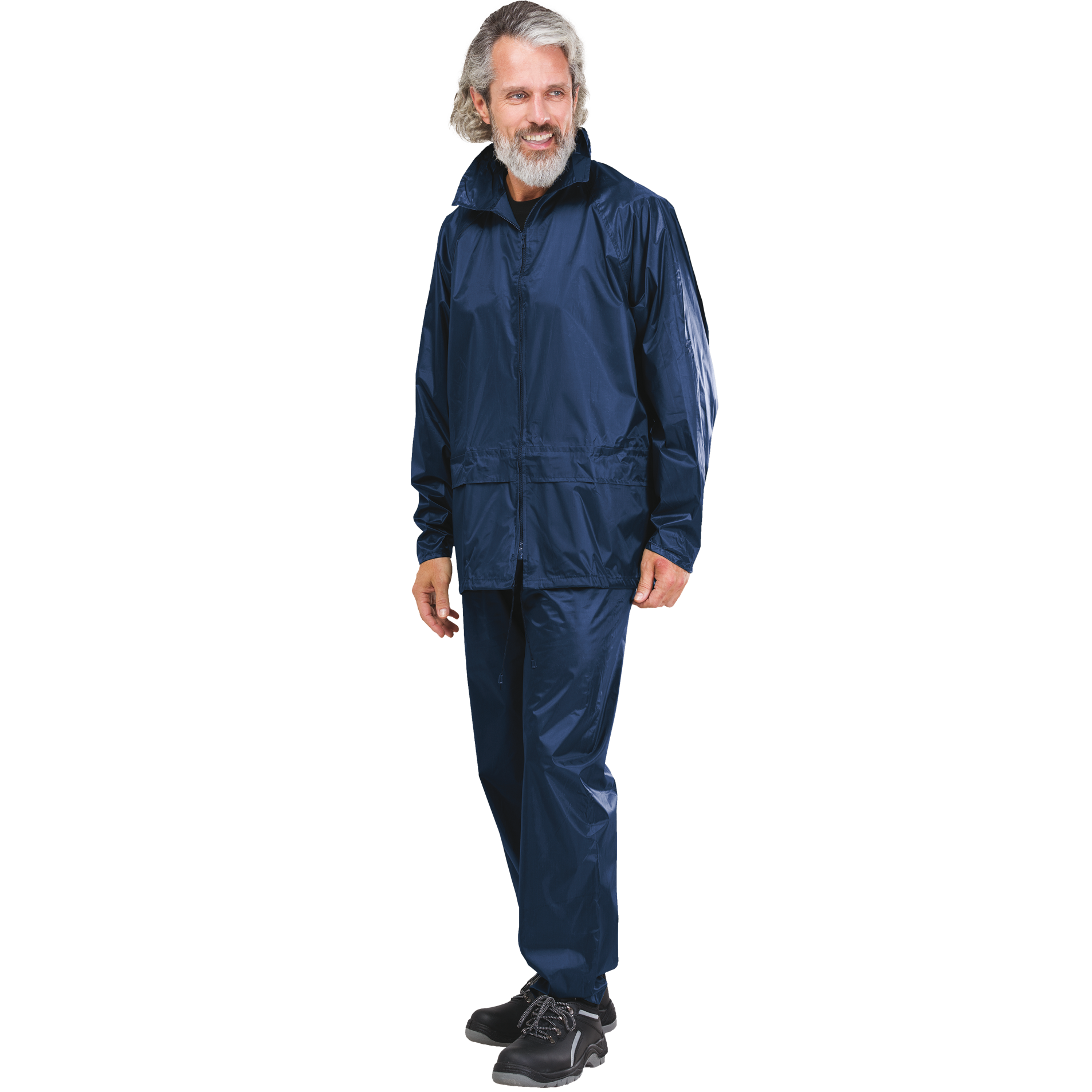 Komplektas apsaugai nuo lietaus (švarkas ir kelnės). Pasiūtas naudojant poliesterį (PCV). Supakuotas patogiame maišelyje. Yra kapišonas. Švarkas užsegamas užtrauktuku. Yra galimybė susiaurinti rankogalius. Kelnių viršutinė dalis turi elastinę juostą, patogias kišenes bei papildomą susiaurinimą kelnių galuose.