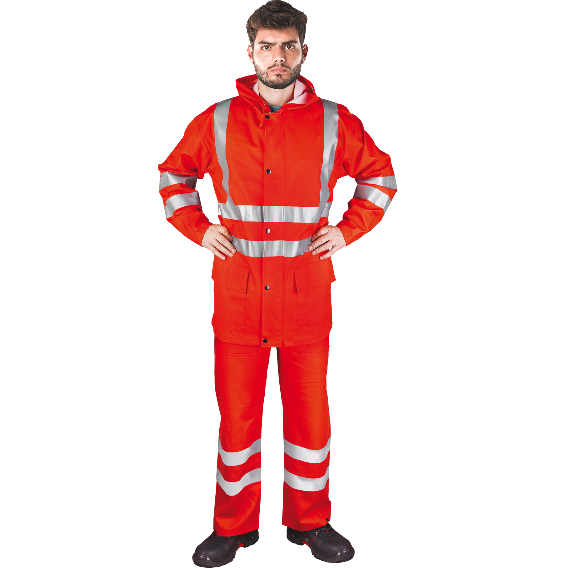 Aukštos kokybės komplektas apsaugai nuo lietaus (apsiaustas ir kelnės). Su šviesą atspindinčiomis detalėmis. Yra kapišonas. Pagamintas iš PU/PVC, 0,5 mm storio.Lankstus ir patogus, sukurtas pastoviam naudojimui. Užsegama užtrauktuku. Reguliuojama apimtis tiek švarkelio, tiek kelnių.