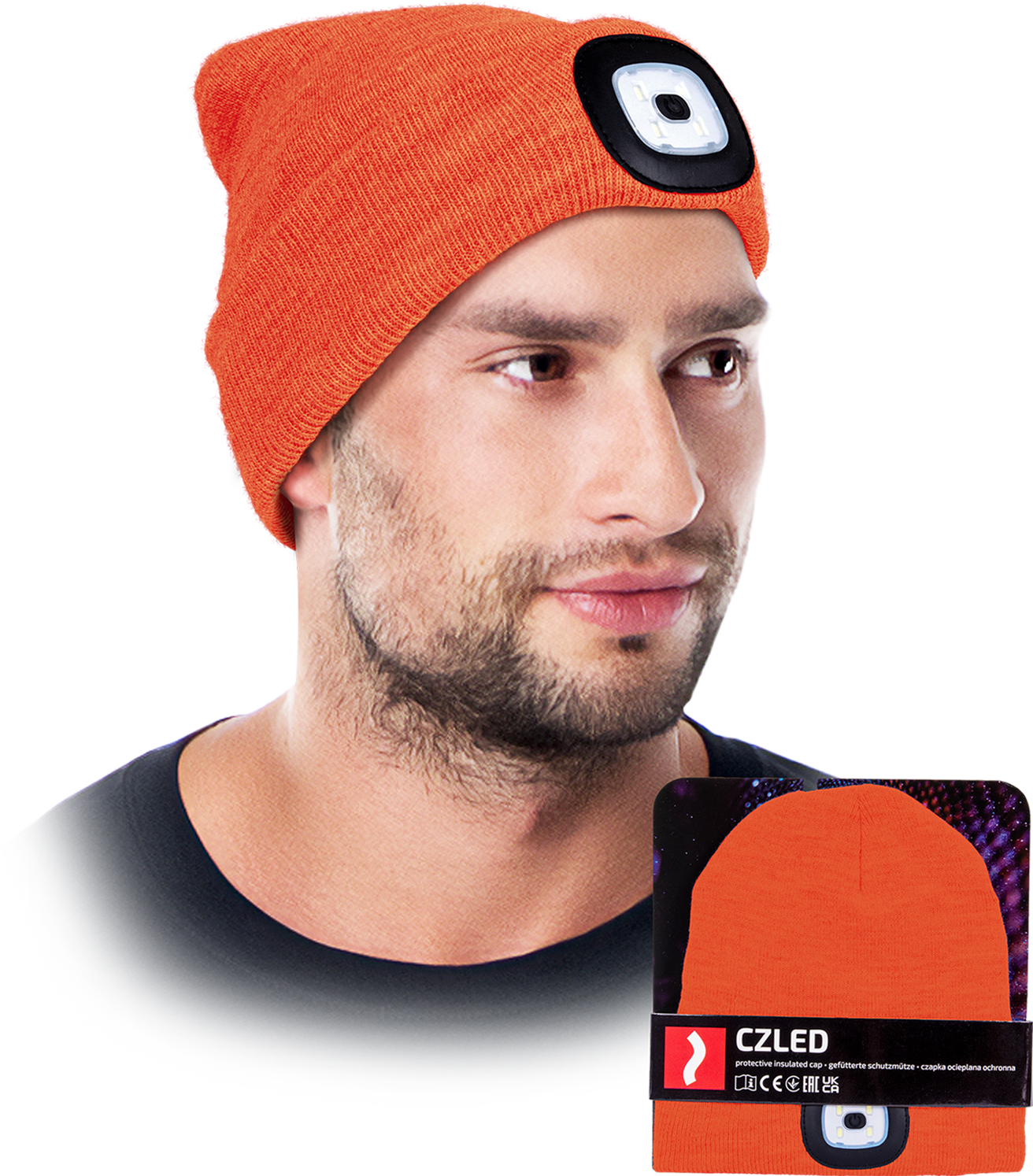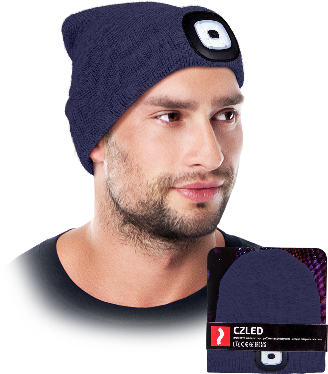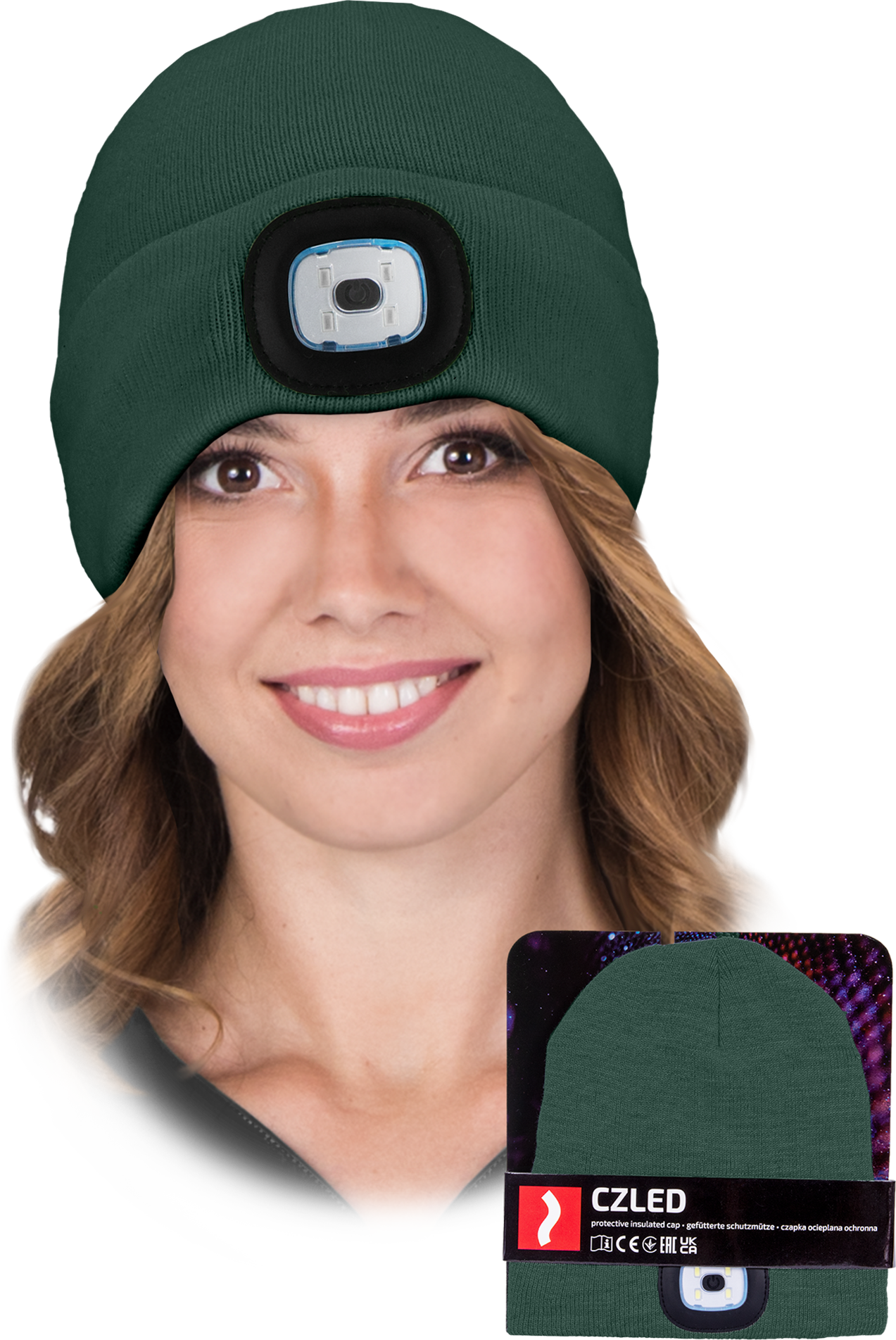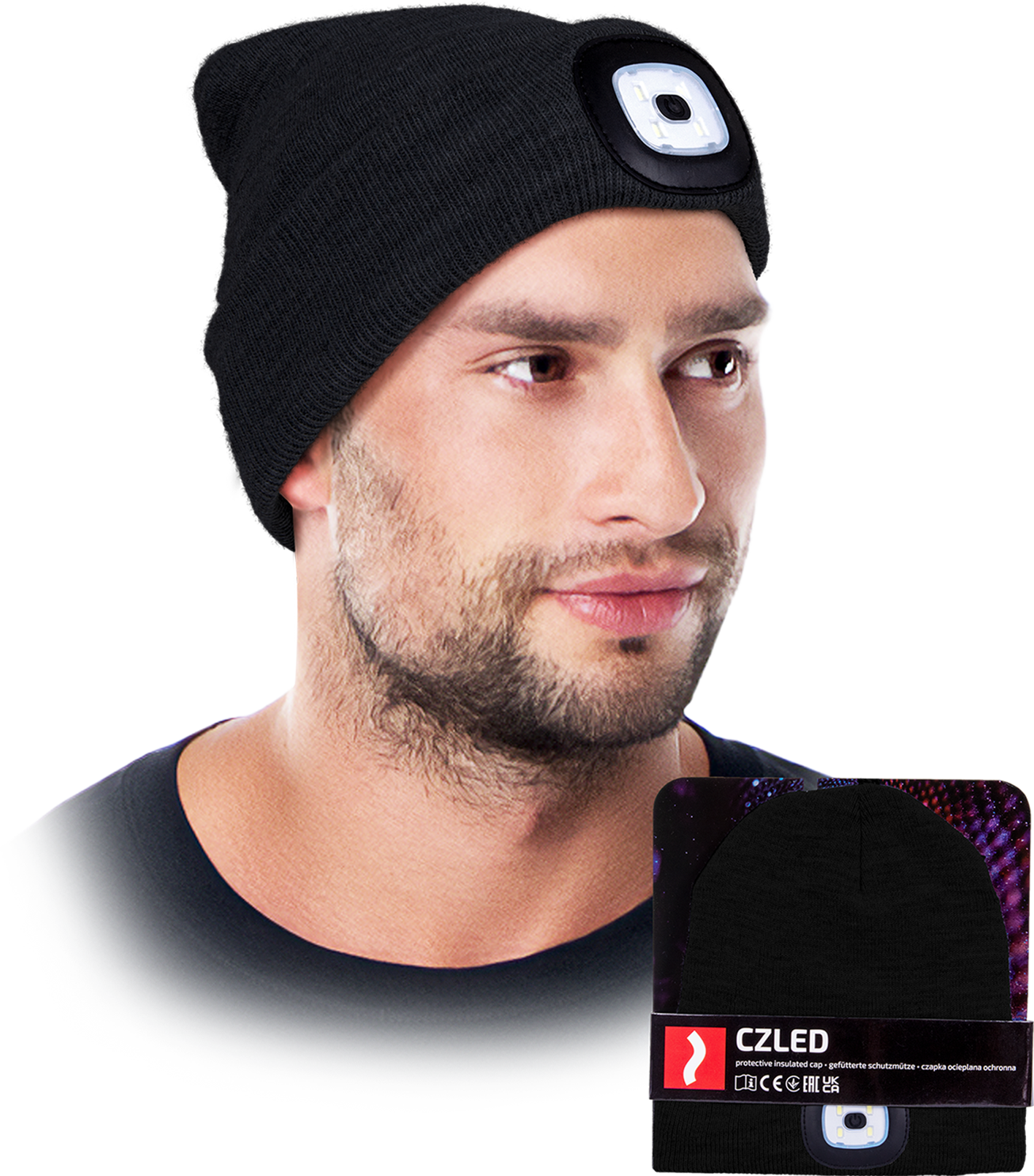 Megzta tampri šilta kepurė priekyje turi nuimamą LED apšvietima, naudingą prasto apšvietimo sąlygomis. Įkraunamą šviesos diodą galima įkrauti per USB jungtį.