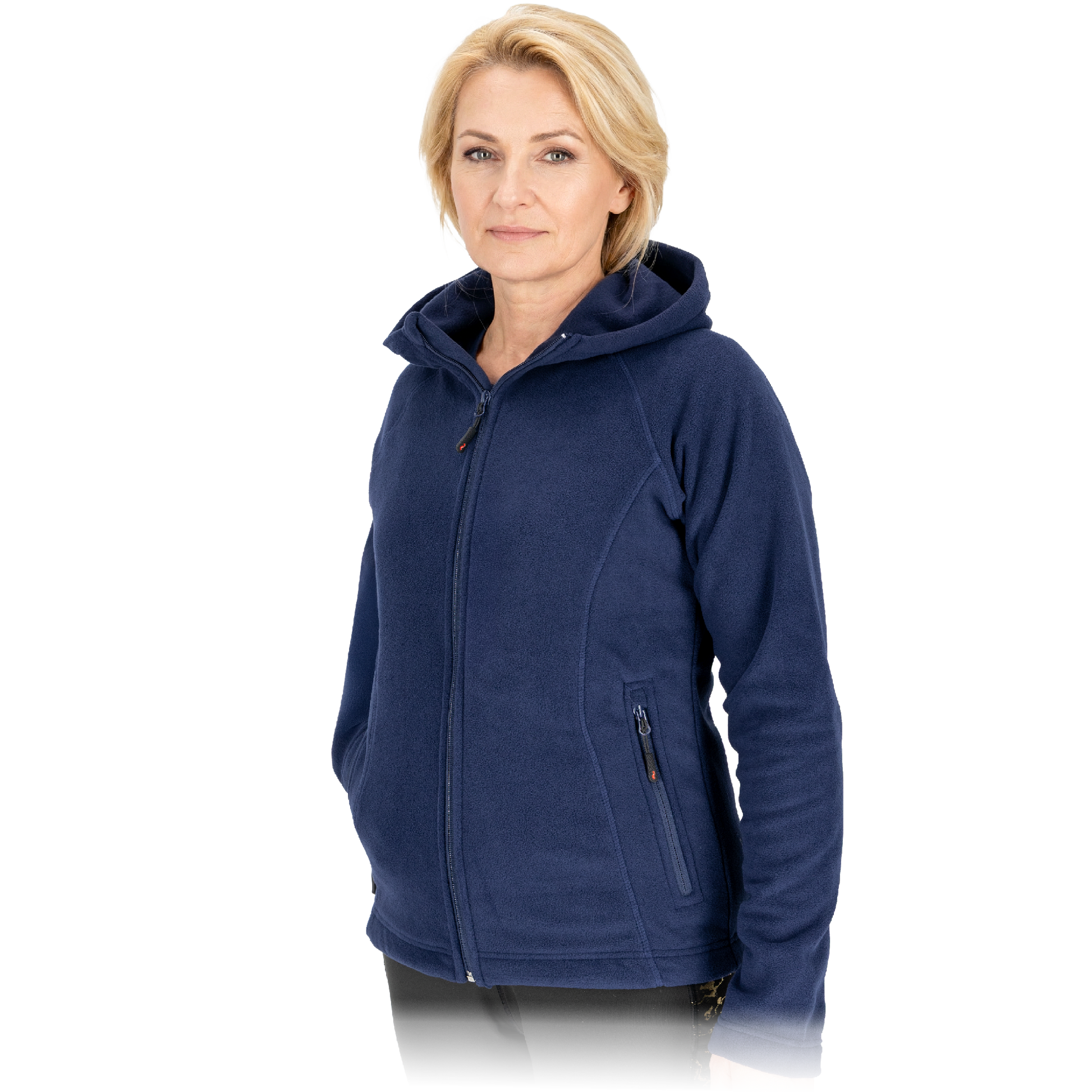 Minkštas, šiltas ir patogus moteriškas flisinis džemperis POLAR LADY, su gobtuvus, mėlynos spalvos
