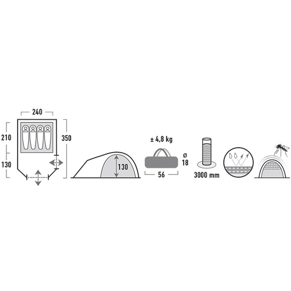 Kupolinė palapinė High Peak (Vokietija), turi funkcionalų prieangį, kuriame galima laikyti daiktus ir apsaugoti vidinį palapinės įėjimą nuo lietaus ir vėjo. Šoninės durys leidžia įeiti į miegamąją vietą arba išeiti iš jos iš dviejų pusių. Priekines duris lengva susukti ir pritvirtinti prie šono. Užtikrinama nuolatinė ventiliacija. Patvarūs ir tvirti, 5 mm plieniniai kaiščiai bei kabliniai kaiščiai gairelėms nelinksta ant kieto pagrindo. Gerai matomi palapinės strypai, vaikščiojimo virvės ir juosta aplink palapinę. Vidinė palapinės dalis su Vario Vent Control vėdinimo kontrolės sistema. Tinklinė dalis apsaugo vidinę palapinę nuo vabzdžių. Vidinis užtrauktuku užsegamas atvartas – lengvai reguliuojamas ir tvarkingai supakuojamas į lengvai surenkamą kišenę. Vidinėje palapinėje yra lempos laikiklis ir 3 kišenės. Greitai ir lengvai pastatoma.