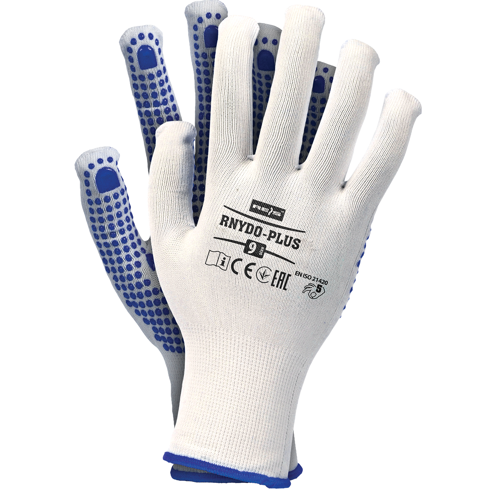 Apsauginės pirštinės, medžiaginės, padengtos PVC taškeliais.