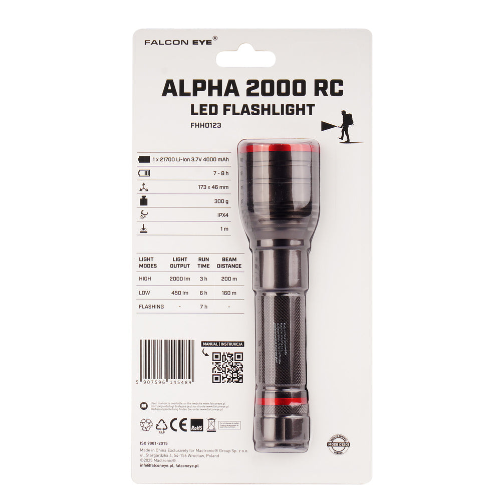 Galingas, patikimas ir intuityviai valdomas Falcon Eye Alpha 2000 RC prožektorius sukurtas tiems, kurie vertina tiek funkcionalumą, tiek paprastą naudojimą. Maksimali 2000 lm šviesos galia, fokusavimo funkcija bei įkraunama baterija leidžia šį įrenginį naudoti tiek patalpose, tiek lauko sąlygomis, stovyklavimams ar žygiams.