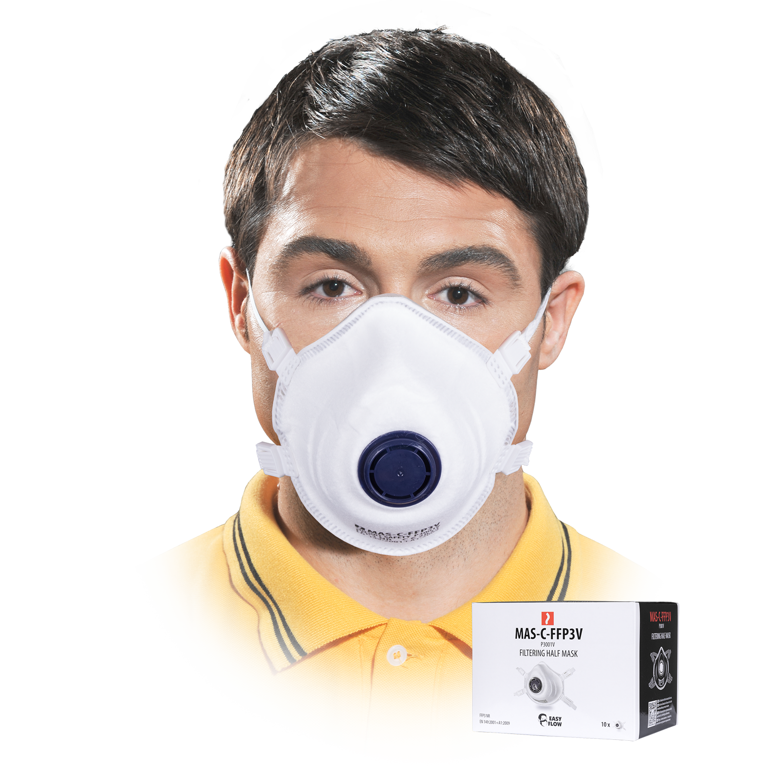 Apsauginis respiratorius, FFP3 klasės, su vožtuvu. Apsaugo nuo netoksiškų arba vidutiniškai toksiškų skystų dalelių ir aerozolių. Apsaugo nuo dulkių, metalo dūmų, alyvos garų ir ozono dujų ir virusų. Plastikinė nosies juostelė išorinėje pusėje užtikrina dar geresnę kvėpavimo takų apsaugą - lengvai pritaikoma pagal veido formą, nepalieka nuospaudų. Ant veido prisitvirtina elastingomis juostelėmis. Pakuotė 10 vnt. (kaina nurodyta visos pakuotės).