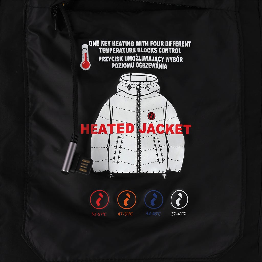 Šildymo funkcija: Liemenėje įrengti šildymo elementai dviejose zonose – nugaroje ir krūtinės srityje, su keturiais temperatūros lygiais: