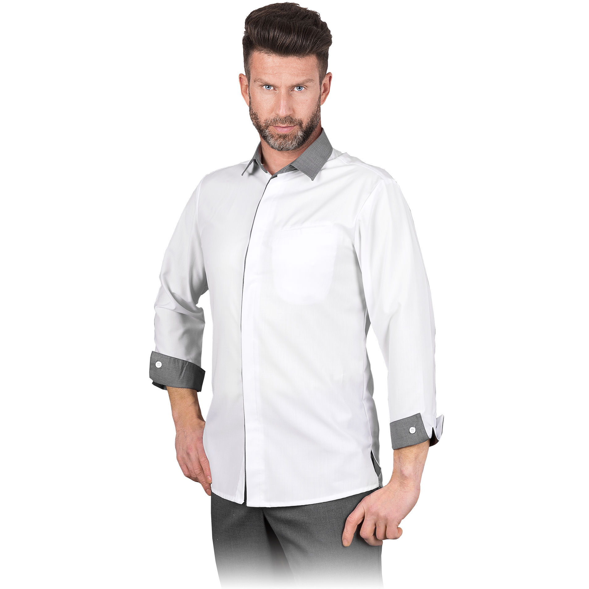 - pilkos medžiagos intarpai suteikia marškiniams šiuolaikišką išvaizdą