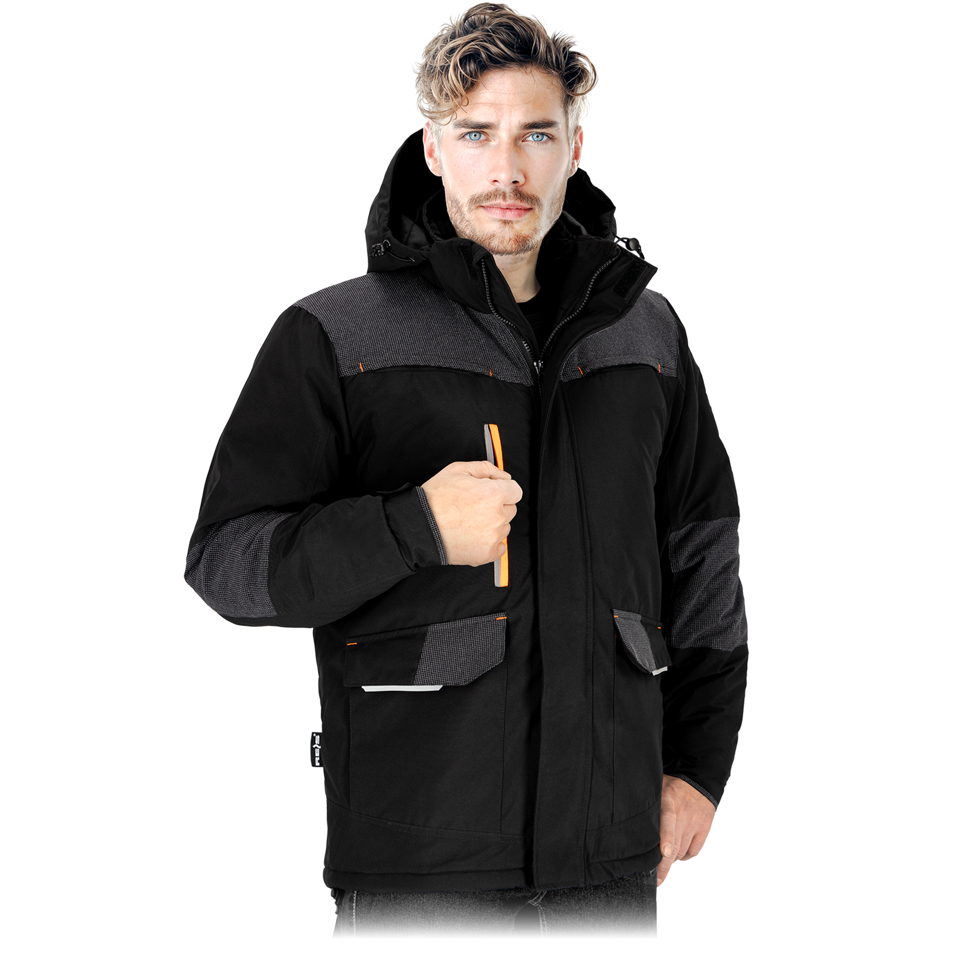 - Nuimamas reguliuojamas kapišonas su virvelėmis ir Velcro užsegimu – patikima galvos apsauga nuo šalčio.